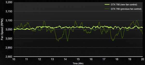 Диаграмма показывает скорость вращения вентилятора в бенчмарке Unigine Heaven 4.0 в разрешении 1920×1080 с полноэкранным сглаживанием и максимальными настройками, при помощи двух разных алгоритмов управлением вентилятором — старого и нового. Так как технология Boost 2.0 динамически изменяет частоту вращения вентилятора, чтобы поддерживать целевую температуру, то если не фильтровать входные значения температуры, получаются довольно ощутимые скачки частоты вращения от 2980 до 3100 об/мин, а это вызывает повышенный уровень шума. Новый же алгоритм, который применили в Geforce GTX 780, использует адаптивный фильтр температуры, чтобы избежать слишком частого изменения частоты вращения и понизить итоговый уровень шума.