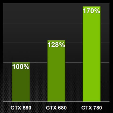 Понятно, что по сравнению с предшествующей моделью Geforce GTX 780 обеспечивает неплохой прирост производительности, а что будет, если сравнить с Radeon HD 7970? Следующая диаграмма показывает сравнение скорости рендеринга новинки с Radeon HD 7970 в нескольких играх в разрешении 2560×1600.