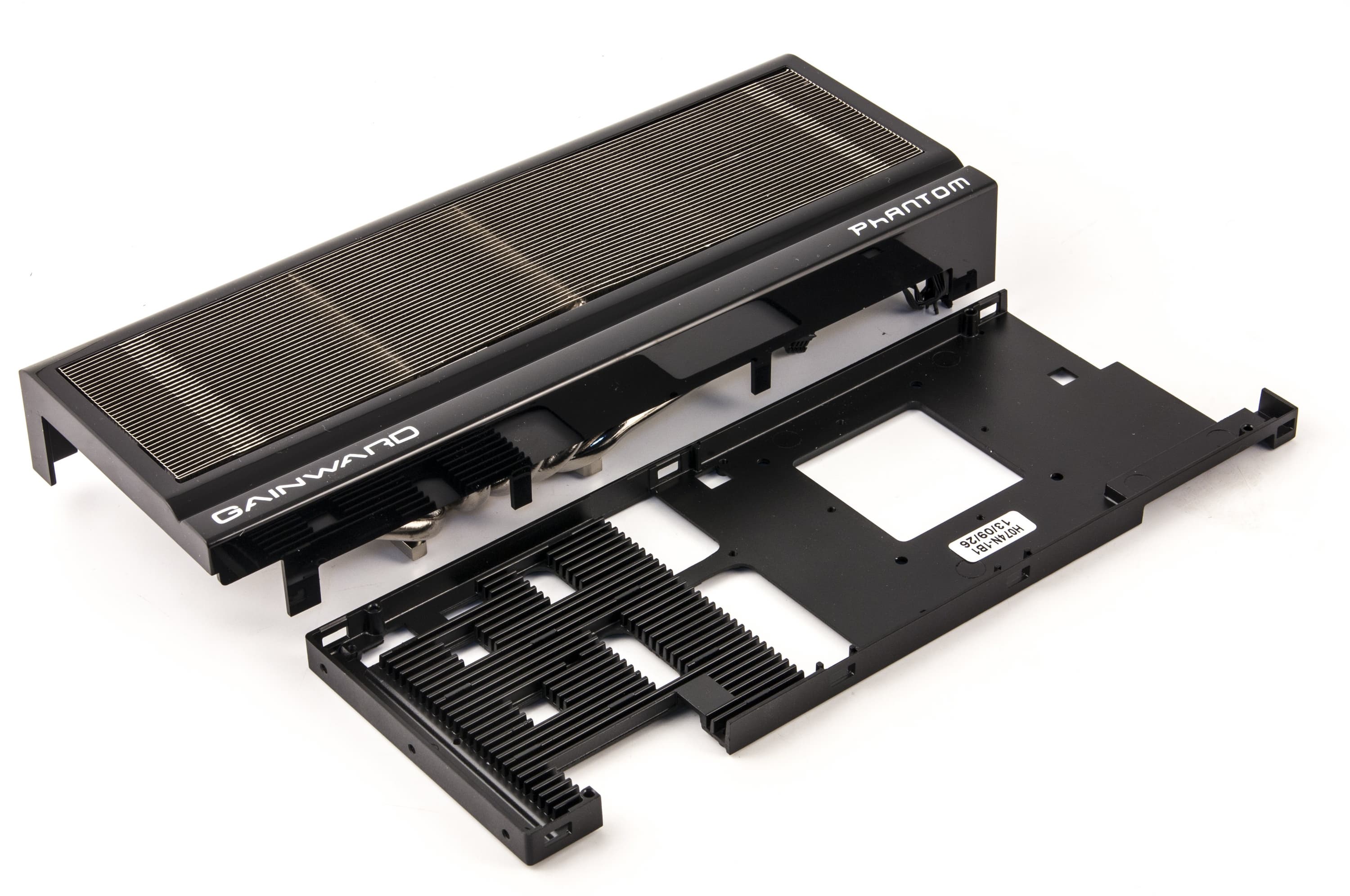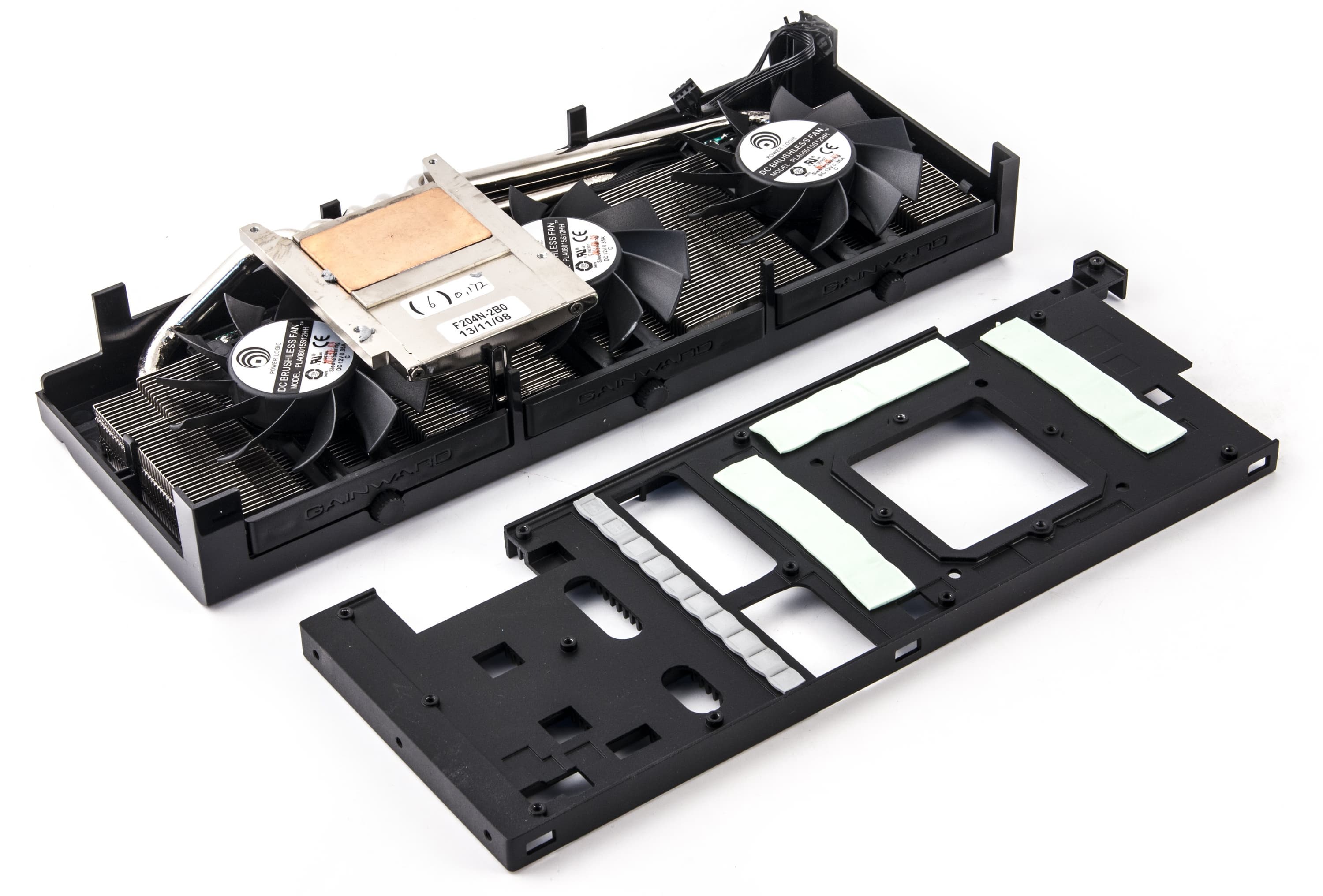 Мы видим большой радиатор во всю длину карты, и от подошвы, прижимающейся к ядру, к радиатору идут тепловые трубки. На радиаторе закреплены три вентилятора, которые засасывают воздух снаружи и прогоняют его через радиатор. Всё это покрыто кожухом, поэтому снаружи создается ощущение, что СО не имеет вентиляторов, так как их не видно.