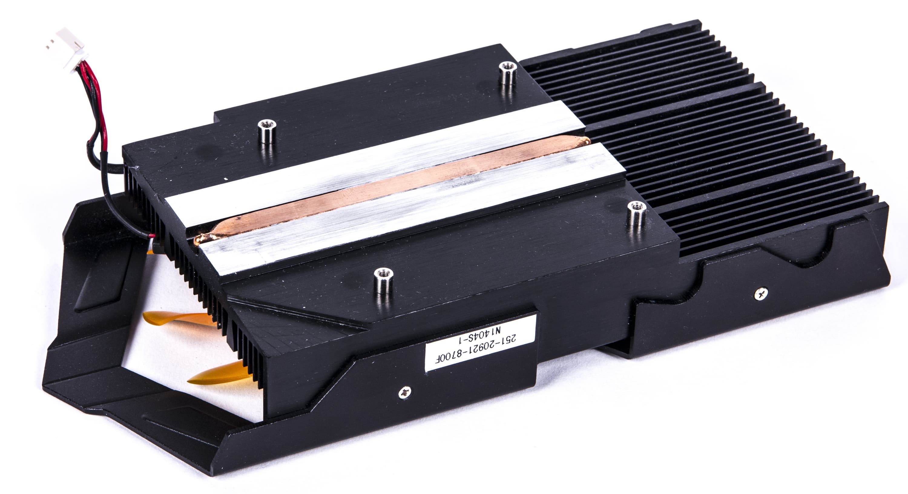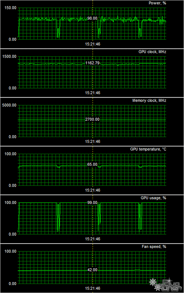 Основой СО является прямоугольный радиатор (с имеющейся в основании тепловой трубкой). На радиаторе установлен кожух с двумя вентиляторами. Микросхемы памяти не охлаждаются. После 6-часового прогона под нагрузкой максимальная температура не превысила 65 градусов, а максимальная частота вращения вентилятора достигала 1000 оборотов в минуту, что сохраняло кулер практически бесшумным. В целом мы получили отличный результат работы СО, почти на таком же уровне, который мы видели в случае с Palit GTX 750 Ti. Читатели могут высказываться в форуме iXBT.com по поводу того, какие именно шумовые характеристики ускорителей им интересны. Подробнее этот вопрос обсуждался в обзоре карты Palit. | ![]() |