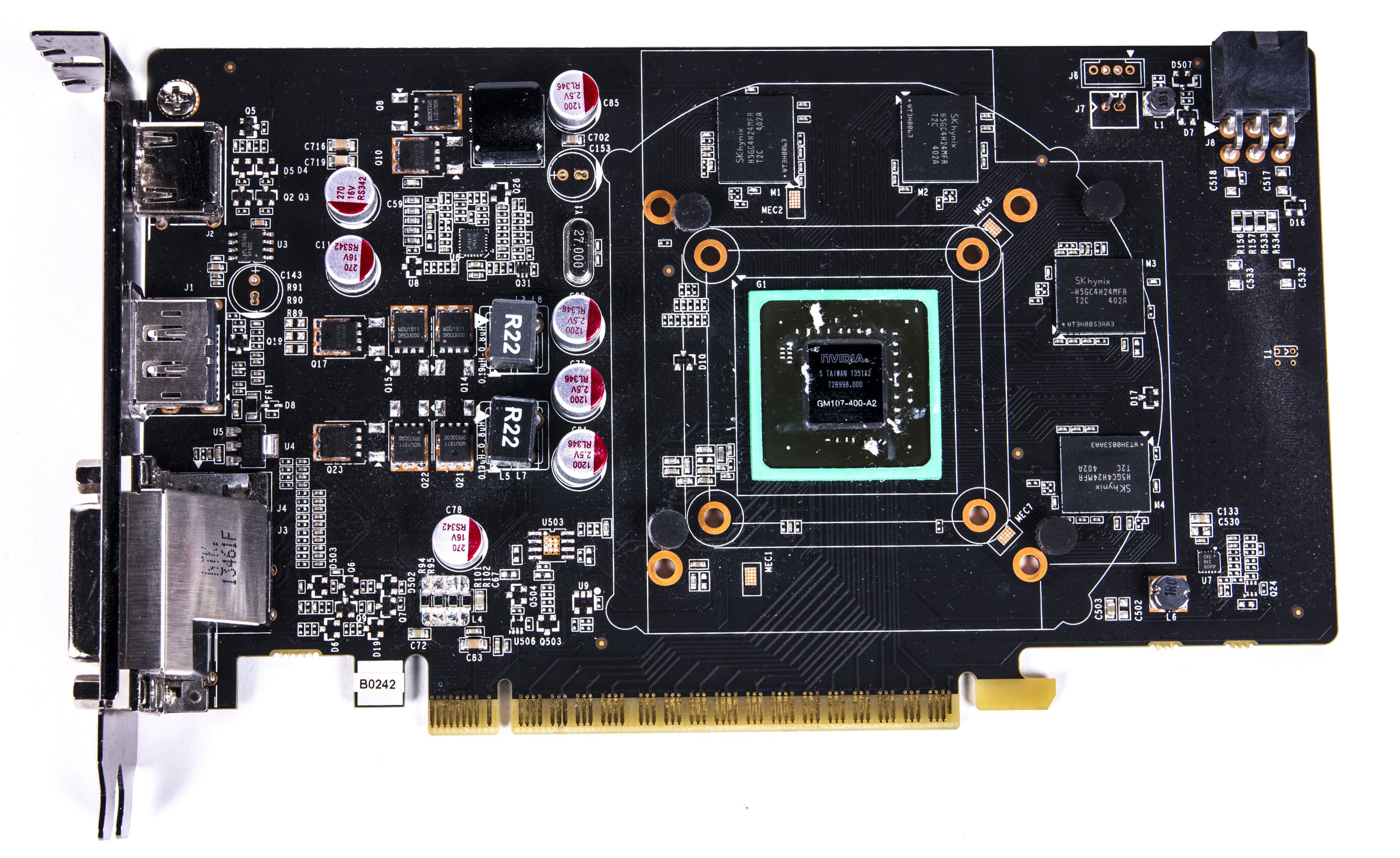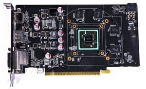 Как и в случае эталонного дизайна, имеется возможность комплектации карты 2 гигабайтами памяти с помощью микросхем по 2 Гбит (8 посадочных мест). Либо — в угоду ретивым маркетологам — на таком относительно слабом ускорителе могут установить 8 микросхем, образующих 4 гигабайта памяти (при использовании микросхем по 4 Гбит, как оно и сделано в данном случае).