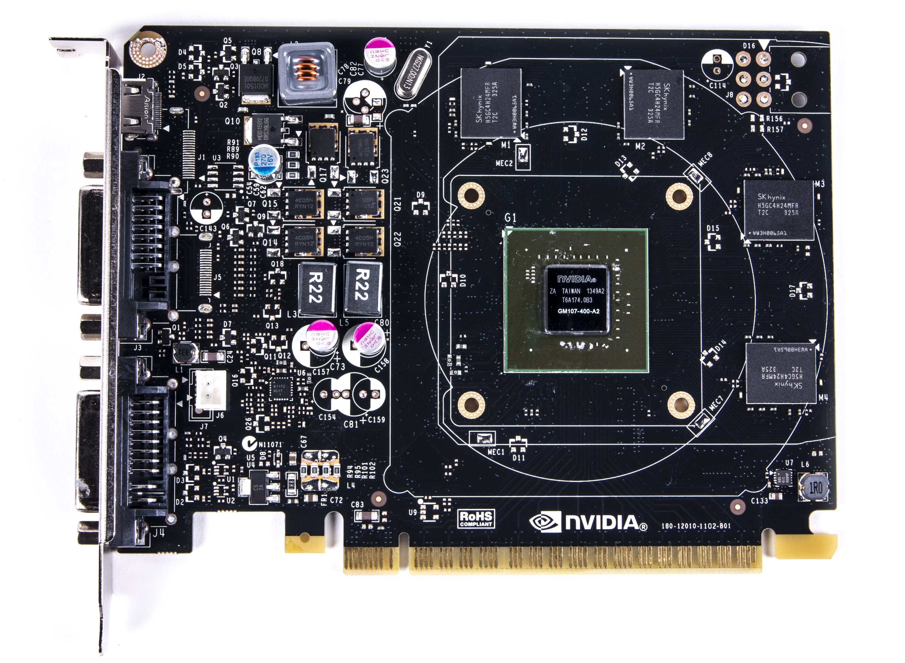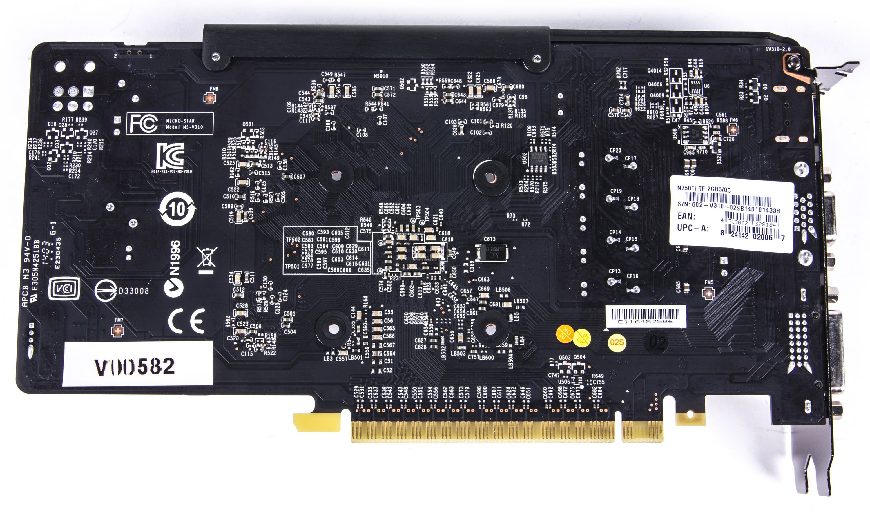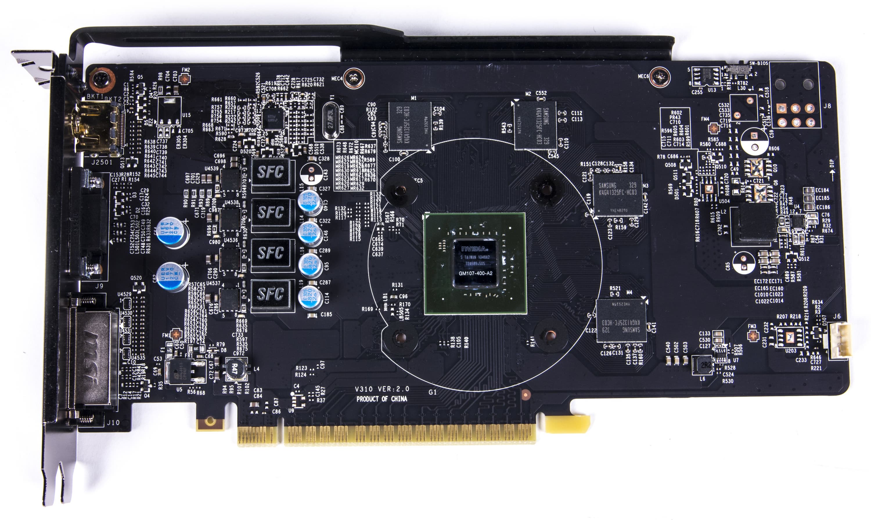 С первого взгляда может сложиться ощущение, что за основу была взята печатная плата от какого-то иного ускорителя. Однако это не так. Во-первых, GM107 уникален по разводке, для него надо изготавливать свою PCB. Во-вторых, после анализа предыдущих ускорителей MSI со 128-битной шиной обмена с памятью, выяснилось, что все же дизайн PCB уникален и предназначен именно для данного ускорителя. Несмотря на размеры и прочее.