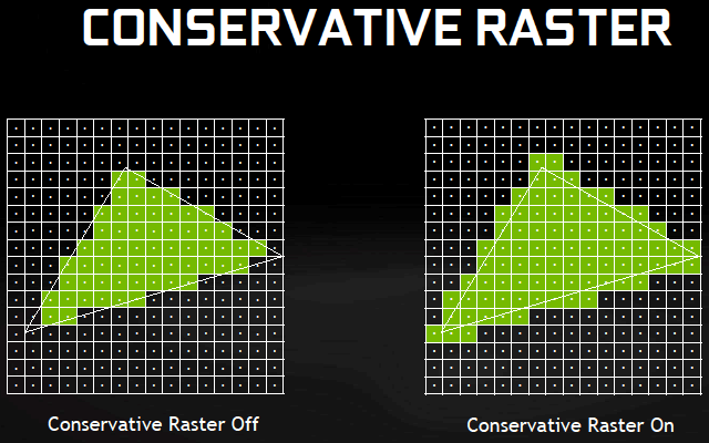 Ну а консервативная растеризация, также поддерживаемая чипами семейства Maxwell и являющаяся обязательной возможностью Feature Level 12.1, отличается от обычной растеризации тем, что в процессе отрисовываются не только те пиксели, в центр которых попала геометрия сцены, а все пиксели, в площадь которых попал даже маленький кусочек треугольника. Эту функциональность можно использовать в процессе вокселизации (конвертации геометрии в воксели), как в алгоритме глобального освещения VXGI от Nvidia, о котором мы неоднократно писали.