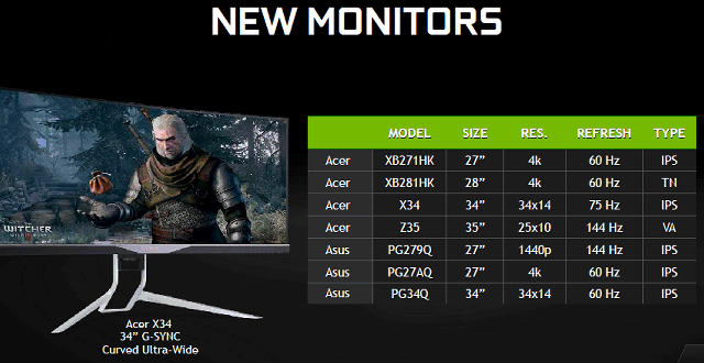 Так, компании Asus и Acer вскоре предложат пользователям по несколько новых моделей G-Sync-мониторов, включая наиболее интересные 34-дюймовые модели с изогнутой IPS-матрицей высокого разрешения 3440х1440 пикселей и частотой обновления в 75 Гц.