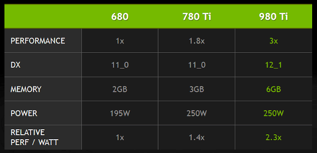 По оценке компании Nvidia, по средней частоте кадров в самых современных играх, включая Witcher 3, Assassin's Creed: Unity, Grand Theft Auto: IV, Far Cry 4, Dragon Age: Inquisition, Shadow of Mordor и Watch Dogs, запущенных на топовой системе с высокими игровыми настройками в разных разрешениях, представленная сегодня модель Geforce GTX 980 Ti от двух до трех раз быстрее, чем Geforce GTX 680 (максимальная разница наблюдается в разрешении 4K, разумеется), а предшественница GTX 780 Ti обойдена в среднем в полтора раза. Приводит Nvidia и конкретные примеры игр, протестированных в самом высоком разрешении: