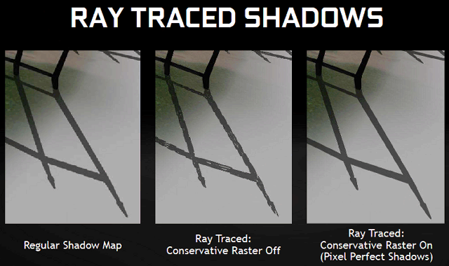 Операция эта далеко не бесплатная, консервативная растеризация в любом случае медленнее привычной, но если графический процессор обеспечивает аппаратную поддержку этой возможности, то вычисления производятся в разы быстрее, что будет полезно для некоторых алгоритмов, ожидаемых в играх в ближайшем будущем. Еще одним примером использования консервативной растеризации в играх можно считать качественный рендеринг теней, просчитанных при помощи трассировки лучей: