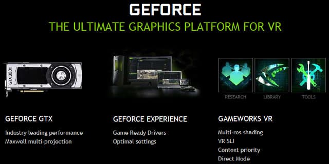 Видеокарты Geforce последнего поколения, основанные на графических процессорах архитектуры Maxwell второго поколения, можно назвать идеальной платформой для разработки и использования систем виртуальной реальности, ожидаемых от многих компаний в ближайшие месяцы. Помимо того, что для VR-систем критичным показателем является высокая производительность и максимально плавная смена кадров, которая вполне обеспечивается топовым Geforce GTX 980 Ti, для них важна и программная и аппаратная поддержка со стороны производителя GPU.