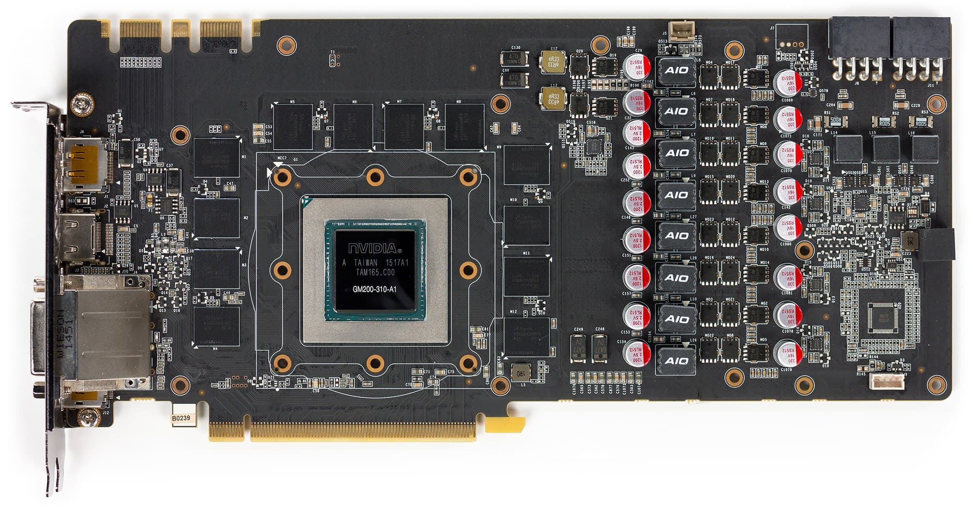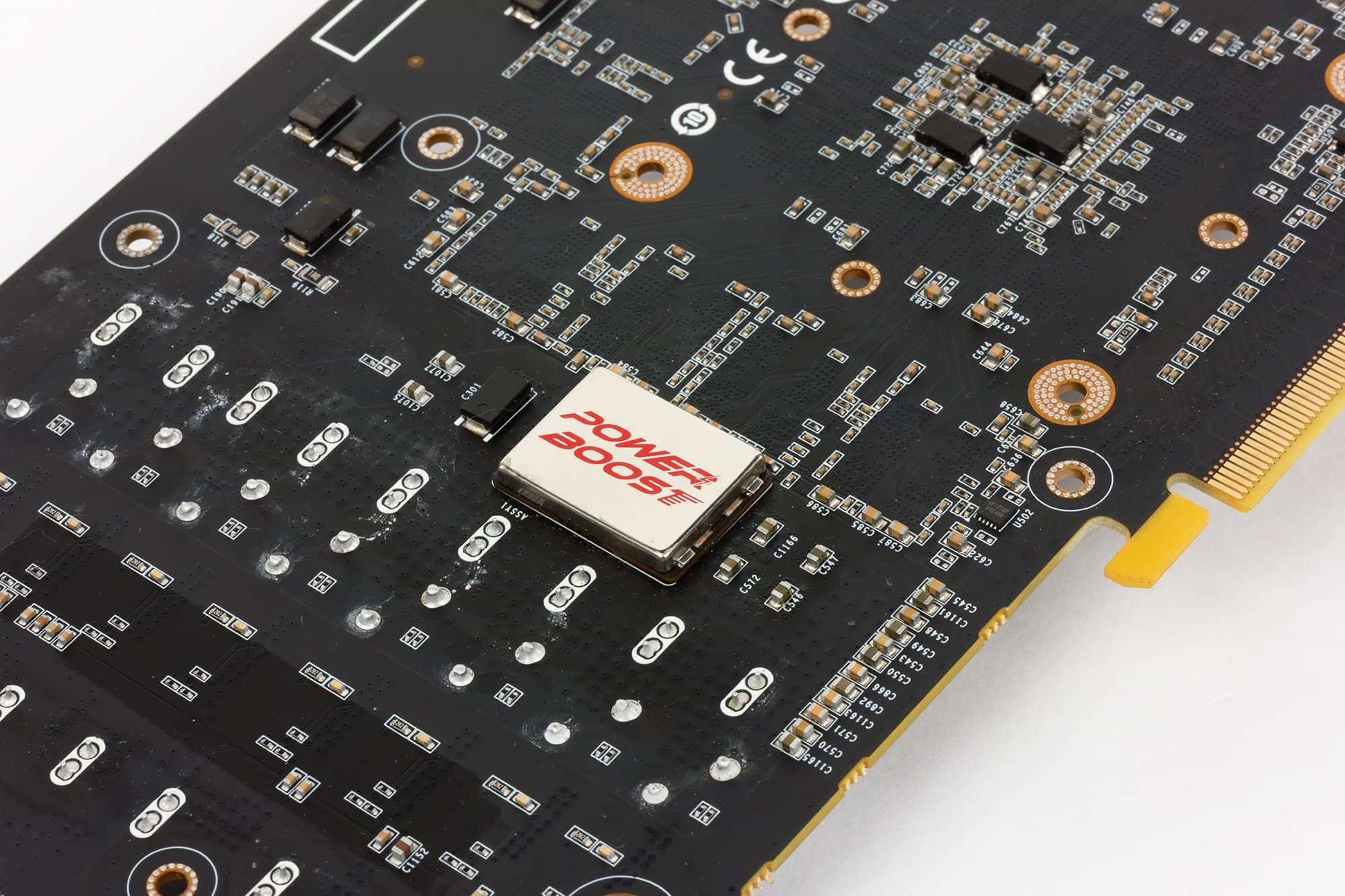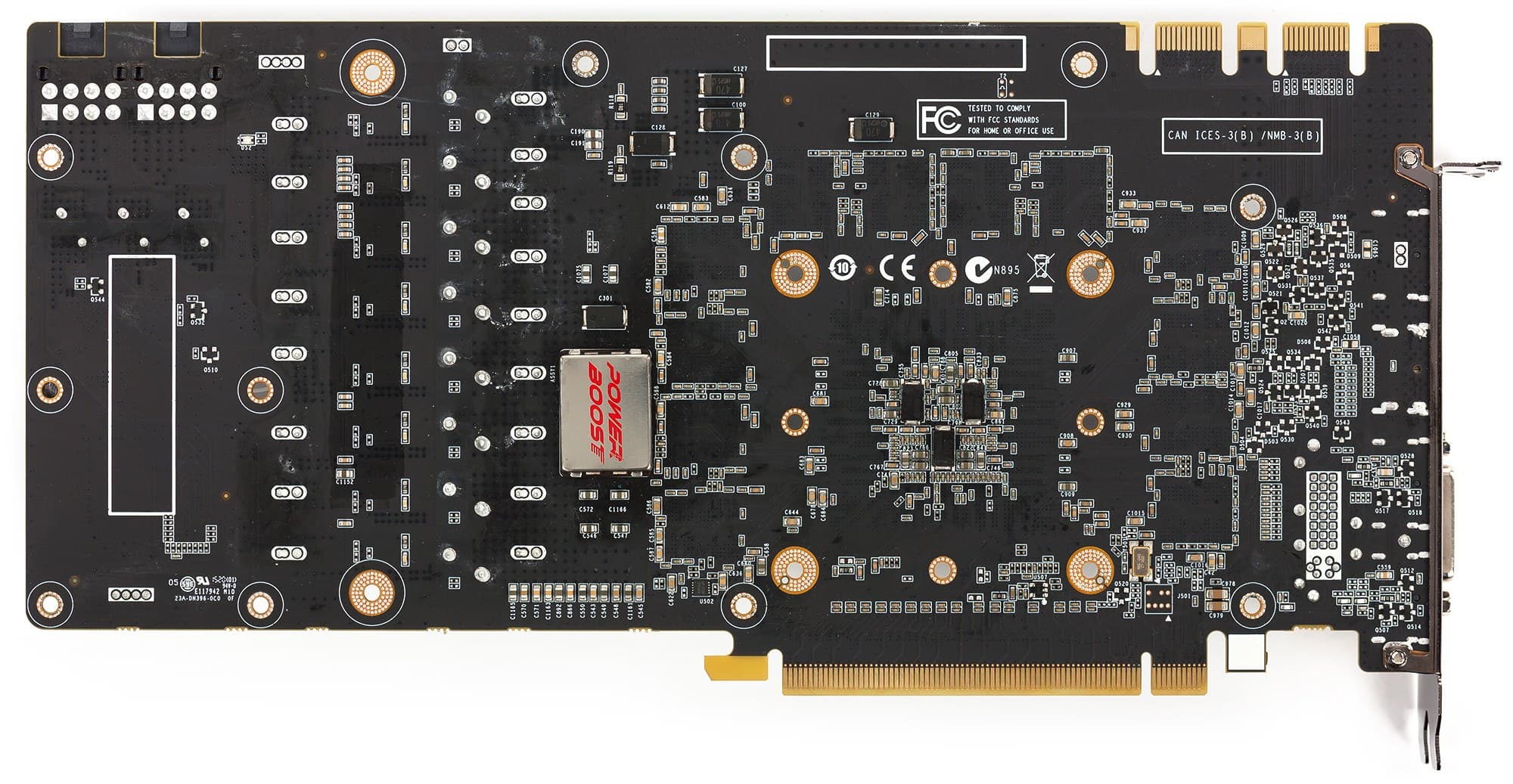 PCB кардинально переработана: от эталонного дизайна сохранилось лишь расположение микросхем памяти относительно ядра. Блок питания также переделан, а схема стала 8-фазной. Реализована внутренняя тонкая настройка параметров работы элементов ускорителя, в частности вольтажа по ядру и микросхемам памяти. Все это дает отличный оверклокерский потенциал, который усилен мощной системой охлаждения и особыми твердотельными конденсаторами на оборотной стороне печатной платы, способными обеспечить стабильное питание даже в условиях сильного перегрева.