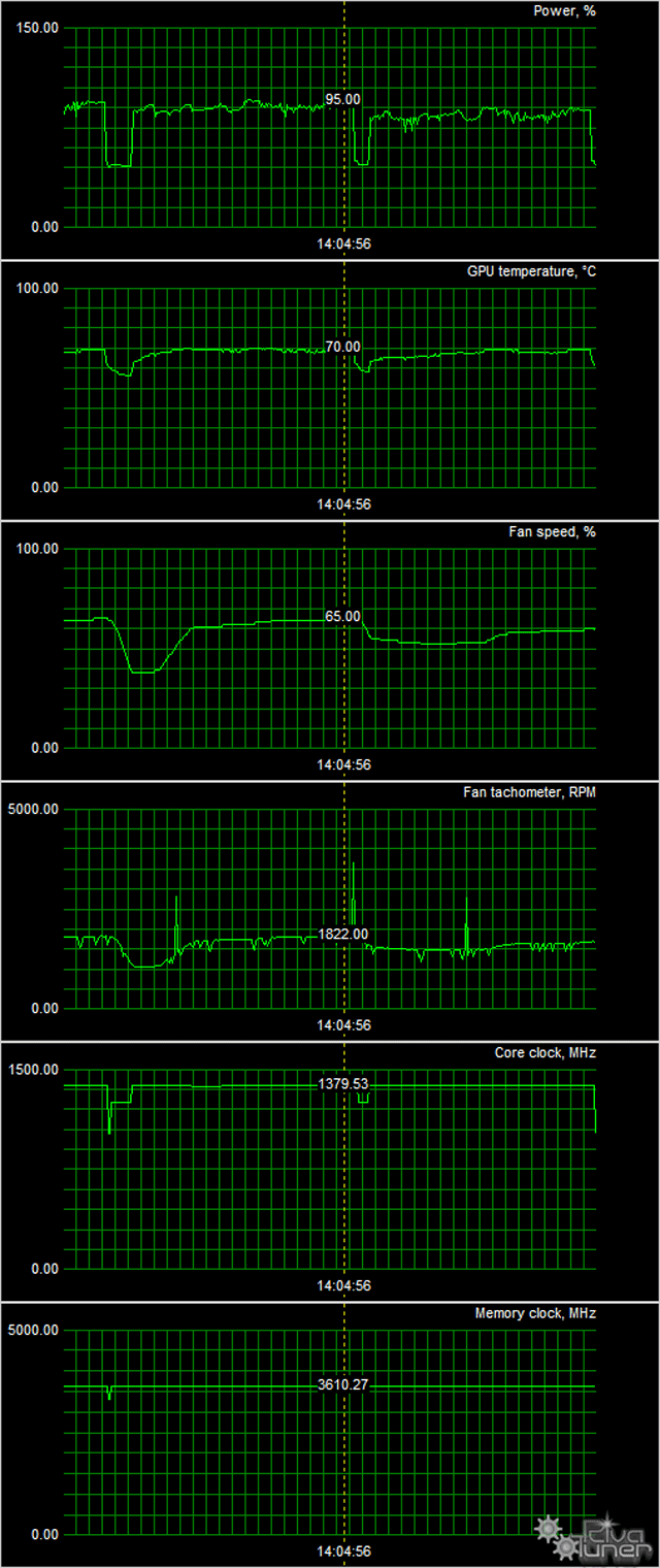 В режиме максимальной нагрузки в 3D температура быстро достигала 60 °C, затем медленно поднималась до 70 °C, вентиляторы при этом раскручивались до 1820 оборотов в минуту и выше, шум вырастал до 40,5 дБА. В итоге под нагрузкой СО достаточно шумная.