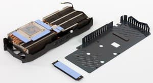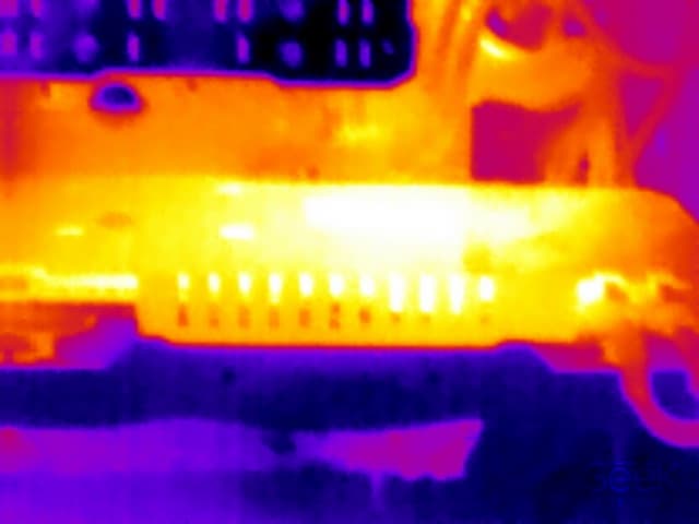 Несмотря на то, что задняя пластина является своего рода радиатором для оборотной стороны карты, полезность ее установки вызывает сомнение: в щелях, приходящихся на длинный торец платы, видны яркие (т. е. сильно нагретые) области. Наибольшая температура — в районе преобразователей напряжения; четко очерченный светлый прямоугольник — это крышка PowerBoost.