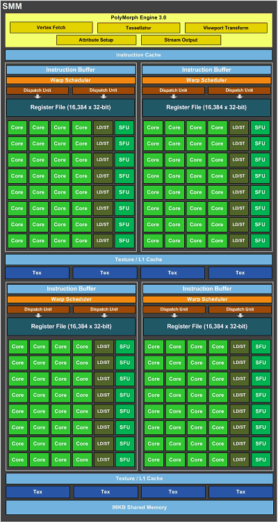 Мультипроцессор второго поколения Maxwell разбит на четыре блока CUDA-ядер по 32 штуки (всего 128 ядер на SMM), каждый из которых имеет собственные ресурсы для распределения команд, планирования обработки и буферизации потока инструкций. Благодаря тому, что каждый вычислительный блок имеет свои блоки диспетчера, вычислительные CUDA-ядра используются более эффективно, чем в Kepler, что также снижает и энергопотребление GPU. Сам по себе мультипроцессор по сравнению с GM204 не изменился: