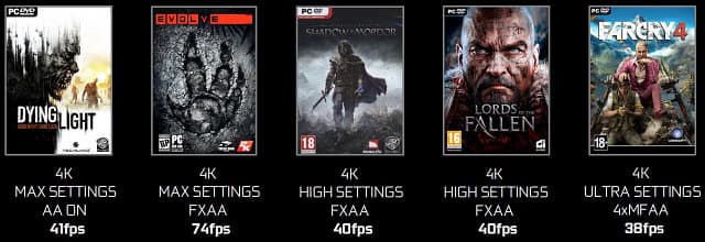 Как видите, частота кадров в 40 FPS и более обеспечивается в большинстве самых «тяжёлых» современных игр, с включенным полноэкранным сглаживанием, в том числе таких проектах, как Far Cry 4 — в этой игре при Ultra-настройках и сглаживании в 4K-разрешении добиться приемлемой скорости рендеринга можно только на Titan X или на многочиповых конфигурациях.