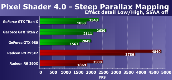 Во втором подтесте с более сложными попиксельными расчетами новинка стала уже на 34% быстрее модели Geforce GTX 980, что ближе к теоретической разнице между ними. Зато Titan X в этот раз уже немного быстрее одночипового условного конкурента на базе одиночного Hawaii. Так как два чипа в составе Radeon R9 295X2 работают отлично, то эта задача выполняется на нём ещё быстрее. Хотя эффективность выполнения математических вычислений в пиксельных шейдерах у чипов архитектуры GCN выше, но выход решений архитектуры Maxwell улучшил позиции решений Nvidia.