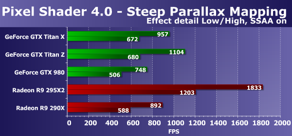 В тесте простого бампмаппинга скорость плат не очень важна, так как эта задача давно стала слишком легкой, а производительность в ней упирается в ПСП или филлрейт. Сегодняшний герой обзора на 23% опережает предыдущую топовую модель Geforce GTX 980 на базе чипа GM204 и чуть-чуть уступает конкуренту в виде Radeon R9 290X. Двухчиповый вариант ещё чуть быстрее.