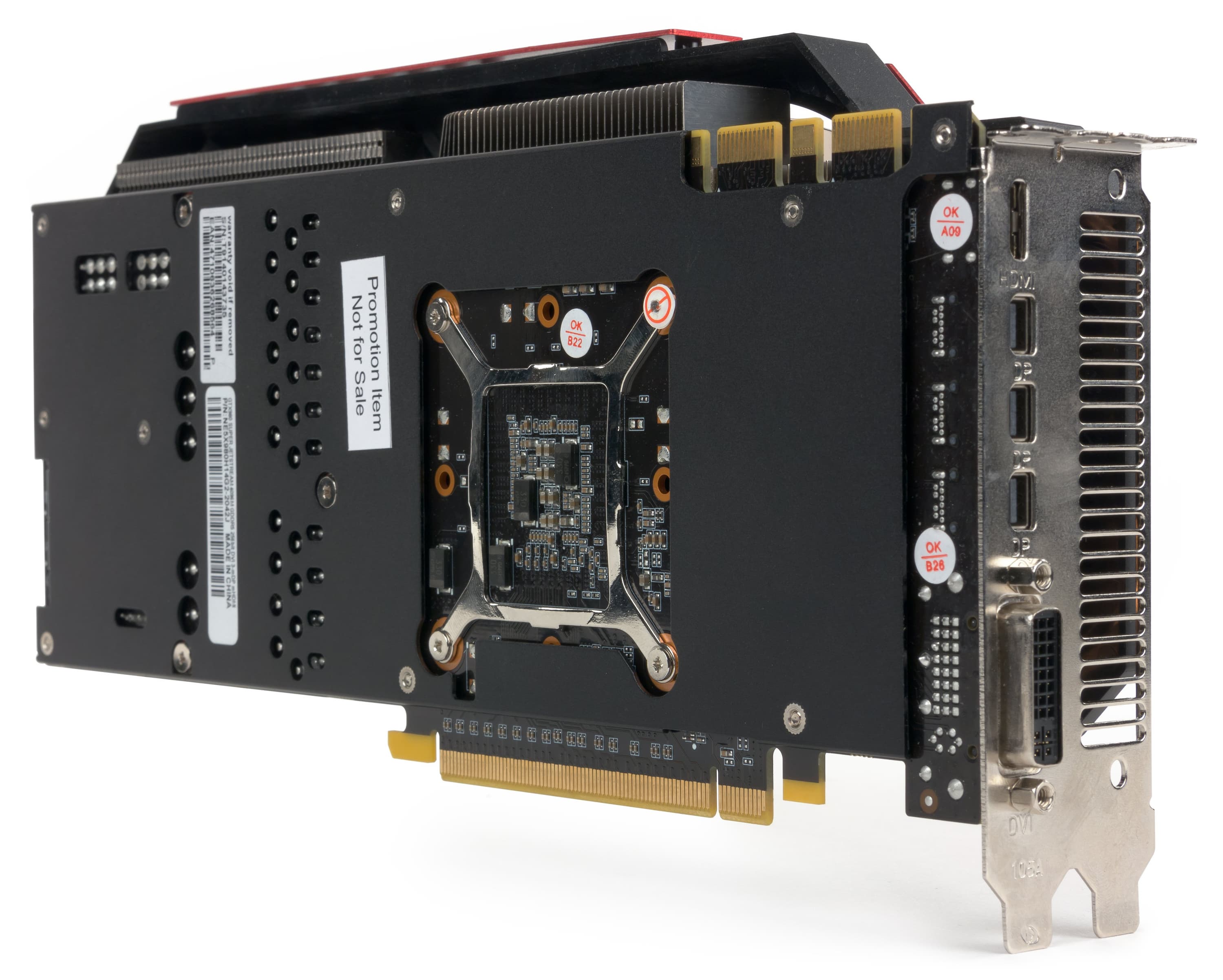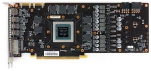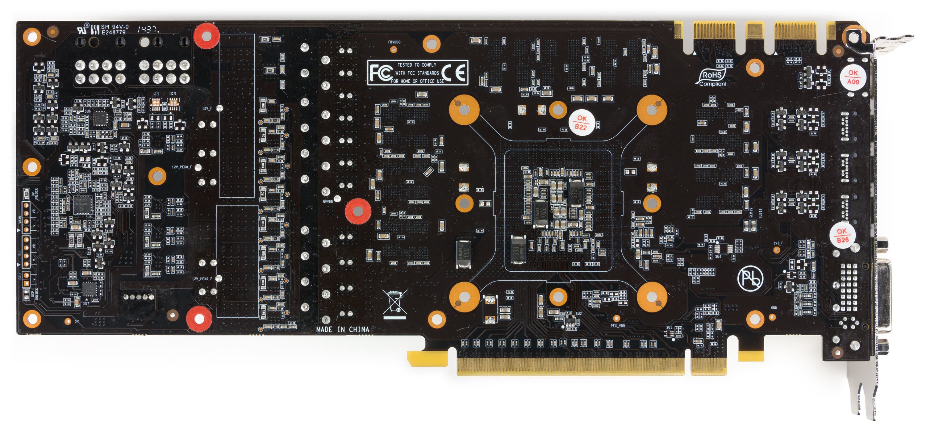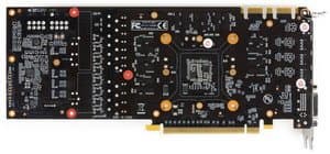 PCB является полной копией карты Gainward (что неудивительно, ведь команда инженеров общая). Обновлен блок питания, схема стала 10-фазной (8+2), что позволило реализовать тонкую настройку вольтажей по ядру и микросхемам памяти для обеспечения хорошего оверклокерского потенциала. Следует снова отметить, что изменен набор гнезд вывода. Вернее, формально он такой же, как и у референс-карты, однако ради того, чтобы уместить все гнезда в одном ряду (на одной планке), DisplayPort выполнен в мини-формате.