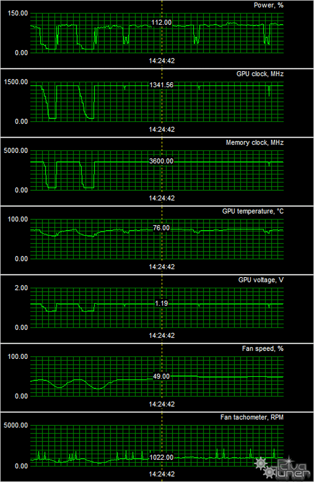 Особенностью СО у данной видеокарты является останов вентиляторов при температуре ядра ниже 63 градусов. Поэтому в режиме простоя в 2D вентиляторы не включались, равно как и при просмотре фильма с аппаратным декодированием (нагрев ядра также не превысил 63 градусов). При достижении температуры ядра 63 градуса вентиляторы начинают работать в режиме кратковременных запусков, так как после включения оных температура падает до 60 градусов. В итоге, если не запускать тяжелые 3D-приложения, шума от карты практически нет. После включения 3D с максимальной нагрузкой частота вращения вентиляторов достигает 1200 оборотов в минуту, шум повышается до 33,3 дБА.