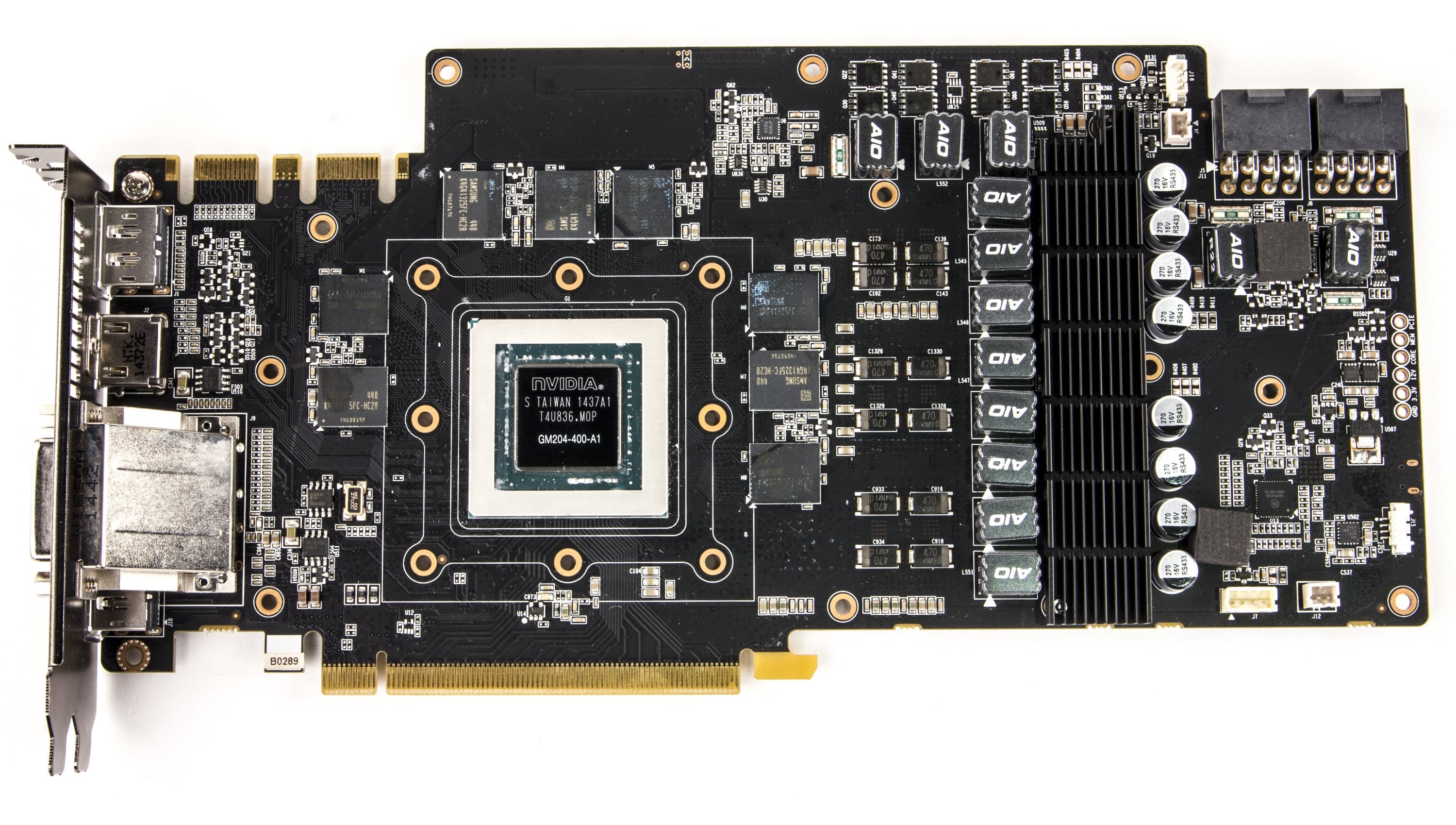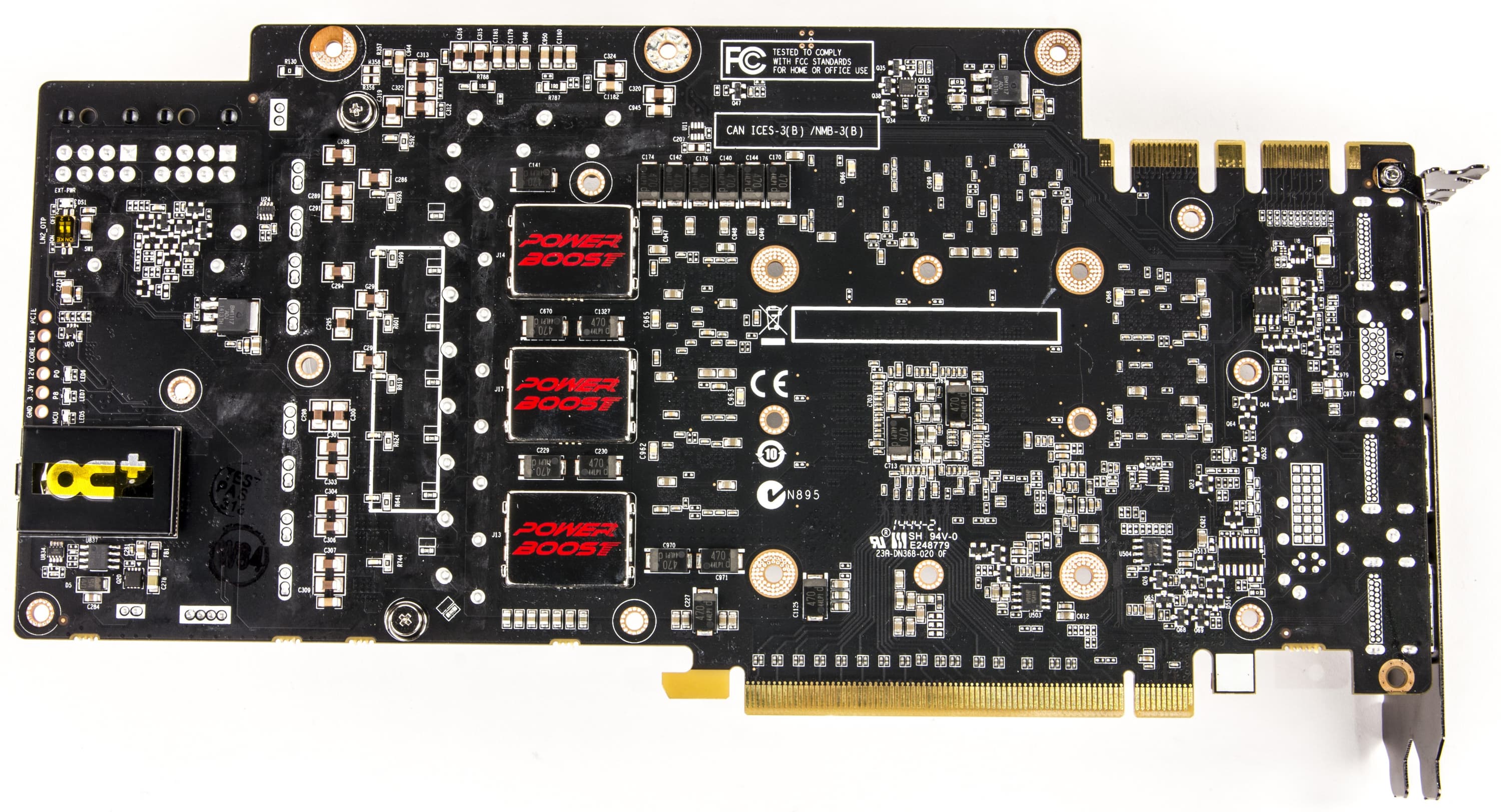 PCB кардинально переработана. От эталонного дизайна остались лишь расположение микросхем памяти относительно ядра и набор гнезд вывода. Блок питания также переделан, а схема стала 11-фазной (9+2). Реализована очень тонкая настройка параметров работы элементов ускорителя, в частности вольтажа по ядру и микросхемам памяти. Все это обеспечивает отменный оверклокерский потенциал, который усилен качественной системой охлаждения и особыми конденсаторами на оборотной стороне печатной платы, способными обеспечить стабильное питание даже в условиях сильного перегрева (разумеется, речь идет о случае экстремального разгона). PCB имеет особый разъем для подключения через Micro-USB к материнской плате (на которой должен быть свободен один из 9-контактных коннекторов для подключения корпусных USB-разъемов).