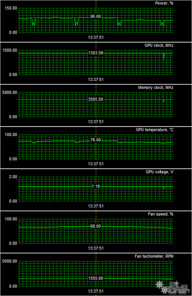 В режиме максимальной нагрузки в 3D температура быстро достигала 73 °С, вращался только один вентилятор (1460 оборотов в минуту, шум 32,3 дБАА), второй оставался в простое. При достижении температуры ядра 76 °С начинали вращаться оба вентилятора, но температура тут же сбивалась до 66 °С, после чего второй вентилятор останавливался. Таким образом, максимальный зарегистрированный нами уровень шума — 32,3 дБА.