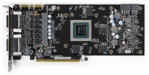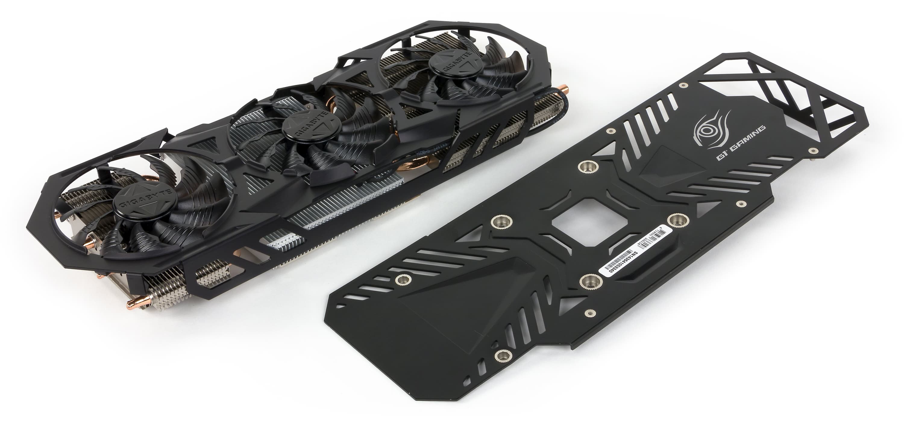 Мы сравниваем с GTX 980, потому что обе карты используют один и тот же GPU, да и шина обмена с памятью у них одинаковая. Тем не менее, Gigabyte использует здесь совершенно иную разводку. Прежде всего, это касается размещения микросхем памяти на обеих сторонах PCB. В результате на печатной плате образовалось много пустого пространства. Почему не сокращены размеры PCB? Возможно, из-за необходимости крепить систему охлаждения больших размеров. Могут быть и иные причины.