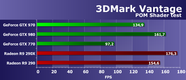 Если сравнивать скорость заполнения сцены новой видеокартой Geforce GTX 970 с видеокартами AMD, то рассматриваемая нами сегодня плата в этом тесте показывает скорость заполнения сцены, превышающую ту, на которую способны и идентичная по цене Radeon R9 290 и даже более дорогая Radeon R9 290X — всё-таки оптимизации по эффективности сжатия данных буфера кадра и большое количество блоков ROP сделали своё дело. Feature Test 3: Parallax Occlusion Mapping
