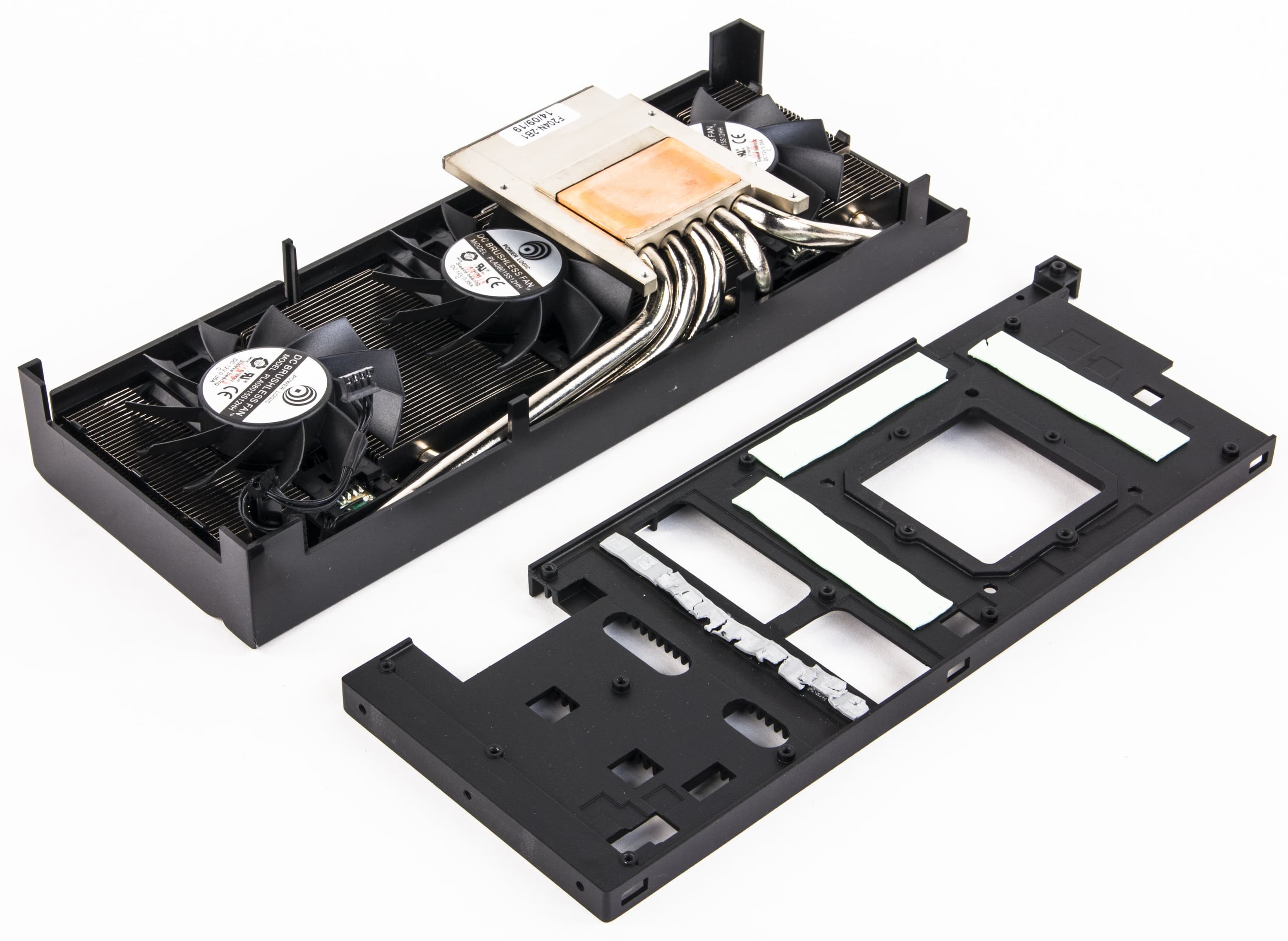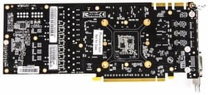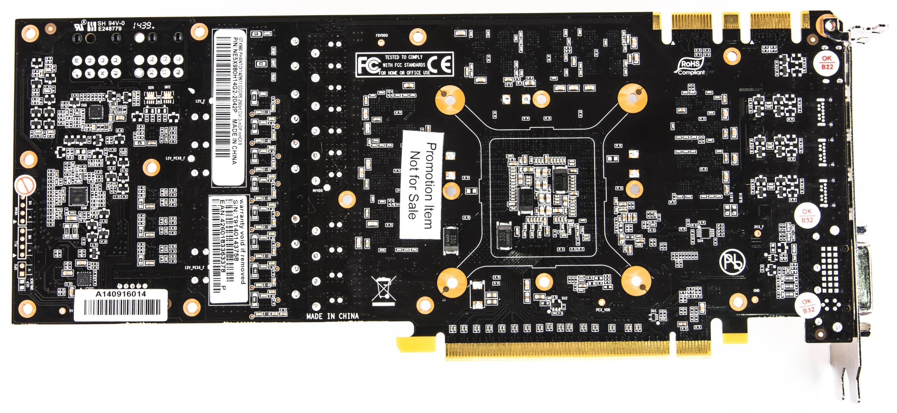 PCB довольно сильно переработана. Расположение микросхем памяти относительно ядра перекочевало из эталонного дизайна, а все остальное — наработки инженеров Gainward. Видно, что блок питания переделан, схема стала 10-фазной (8+2). Поэтому, как я уже многократно говорил, реализована тонкая настройка вольтажа по ядру и микросхемам памяти, что дает хороший оверклокерский потенциал. Также мы видим, что изменен набор гнезд вывода. Вернее, формально он такой же, как у референс-карты, однако ради того, чтобы уместить все гнезда в одном ряду, DisplayPort реализован в формате Mini. Учитывая, что в комплект поставки не входит соответствующий адаптер, это делает использование DP весьма хлопотным (надо искать в магазинах переходник Mini-DP-to-DP).