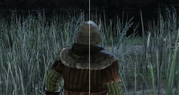 В итоге пользователь получает картинку с более высоким качеством, близким к UltraHD, но на FullHD-устройстве, более сглаженную и красивую. Это особенно заметно на сценах с большим количеством узких полупрозрачных объектов, вроде травы (слева — обычный MSAA, справа — с включенным DSR):