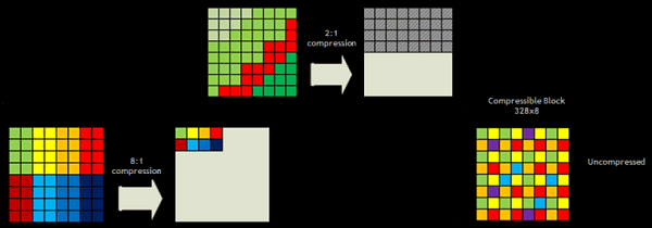 При записи данных в память в GM204 используется новый метод сжатия данных без потерь, а при их чтении экономится полоса пропускания, что особенно важно при таком мощном GPU и лишь 256-битной шине. Новый движок сжатия может использовать несколько методов для разных данных. Каждый блок из 8x8 пикселей сначала исследуется на предмет возможности сжатия без потерь, если он содержит одноцветные блоки по 4x2 пикселя, тогда для таких блоков достигается степень сжатия 8:1. Затем проверяется возможность сжатия блоками 2x2 (степень сжатия 4:1) и так далее.