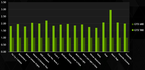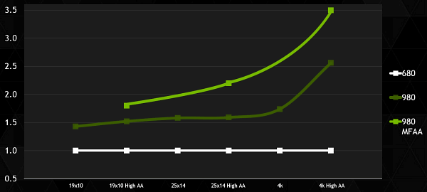По сравнению с Geforce GTX 670, которая является одной из самых популярных топовых видеокарт в современных ПК-системах, новая модель этого же уровня обеспечивает приличный прирост производительности около полутора раз, а в сверхвысоких разрешениях и того больше. А уж если учитывать новый алгоритм полноэкранного сглаживания MFAA, то она и вовсе минимум вдвое лучше, если верить графикам Nvidia.