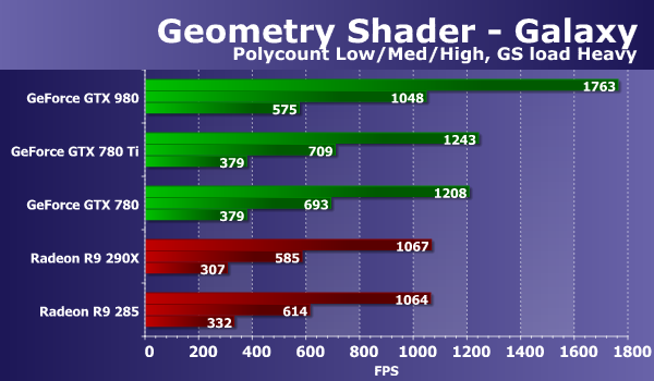При изменении нагрузки в этом тесте цифры слегка улучшились и для плат AMD и для решений Nvidia, но разница невелика и ничего не меняет. Видеокарты в этом тесте геометрических шейдеров слабо реагируют на изменение параметра GS load, отвечающего за перенос части вычислений в геометрический шейдер, поэтому и выводы остаются прежними. Плата Nvidia на базе нового графического процессора архитектуры Maxwell быстрее аналогичных моделей на чипах GK110 до полутора раз и более, а также быстрее обоих решений конкурента — и Radeon R9 290X, и R9 285.