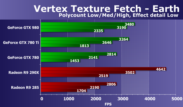 В тестах «Vertex Texture Fetch» измеряется скорость большого количества текстурных выборок из вершинного шейдера. Тесты схожи, по сути, так что соотношение между результатами карт в тестах «Earth» и «Waves» должно быть примерно одинаковым. В обоих тестах используется displacement mapping на основании данных текстурных выборок, единственное существенное отличие состоит в том, что в тесте «Waves» используются условные переходы, а в «Earth» — нет.