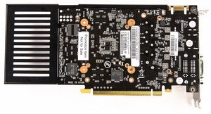 Хочется напомнить, что плата по сути 192-битная, то есть разведена шина шириной в 192 бит, а не 128. Это можно легко выяснить по количеству посадочных мест под микросхемы памяти — их 6. (Сейчас все микросхемы памяти 32-битные, поэтому посчитать нетрудно.) А установлено всего 4 микросхемы, которые и образуют шину в 128 бит.