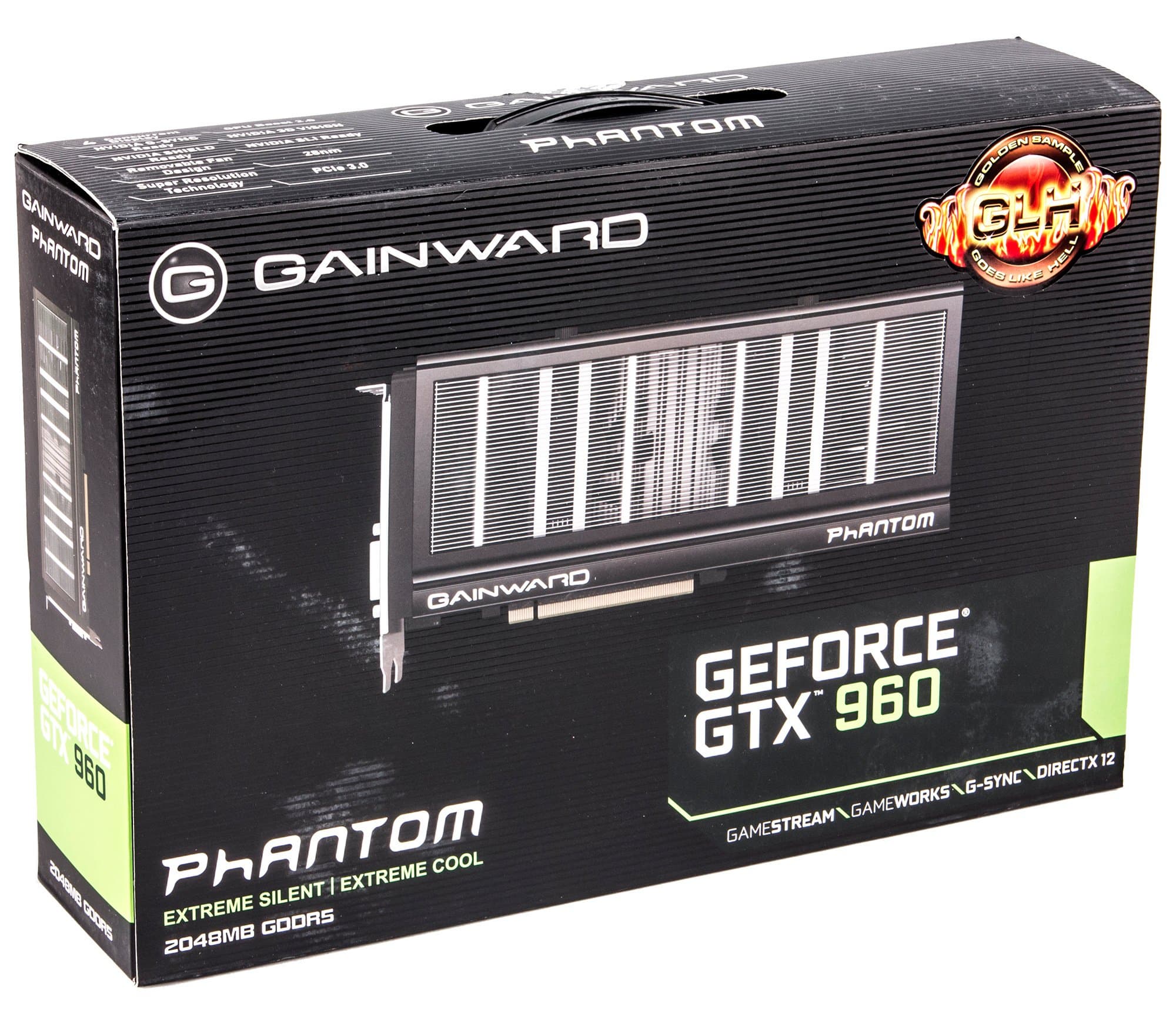 Gainward Geforce GTX 960 Phantom 2048 МБ 128-битной GDDR5 PCI-E — очередной представитель ускорителей среднего уровня последнего поколения. Видеокарта обладает очень хорошей системой охлаждения, которая мало шумит, эффективно работает и к тому же позволяет легко демонтировать вентиляторы для чистки без снятия всего кулера. У этого ускорителя серьезно повышена частота ядра, что приносит весьма ощутимые дивиденды в относительно низких разрешениях (про высокие речь не идет — там все сдерживается низкой ПСП из-за 128-битной шины).
