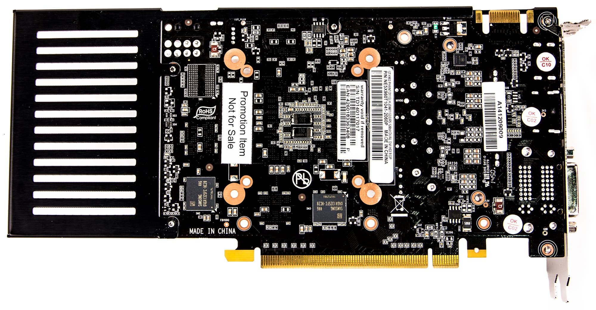 По сути, перед нами та же самая PCB, которую мы уже изучали в обзоре Palit GTX 960. Собственно, это совершенно логично, ведь компания Palit Group обладает обеими марками: Palit и Gainward. Разница лишь в частотах работы и в СО.