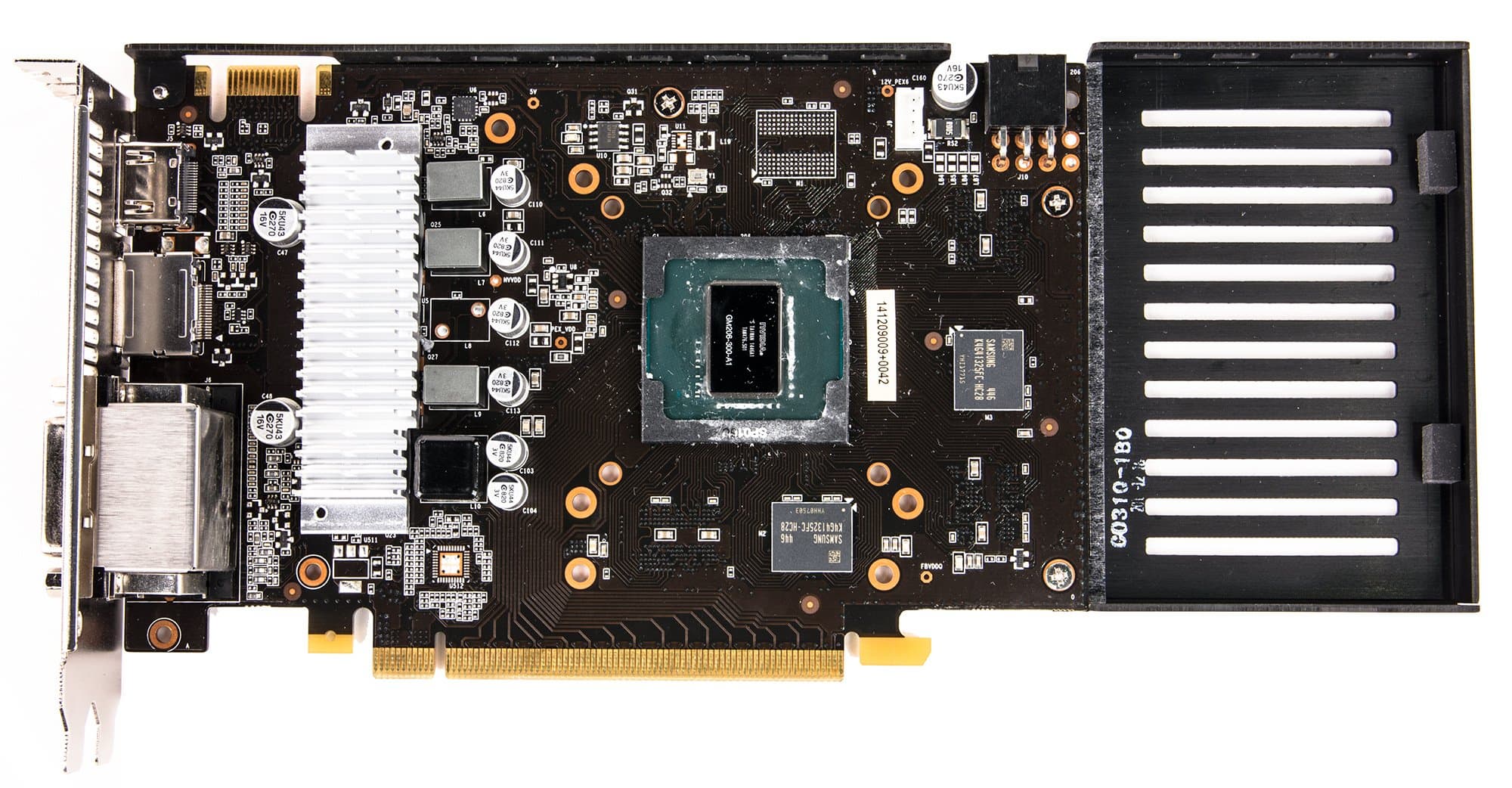 Картa имеeт 2048 МБ памяти GDDR5 SDRAM, размещенной в 4 микросхемах по 4 Гбит (по 2 на каждой стороне PCB). Микросхемы памяти Samsung (GDDR5). Микросхемы расчитаны на номинальную частоту работы в 1785 (7140) МГц. | ![]() |