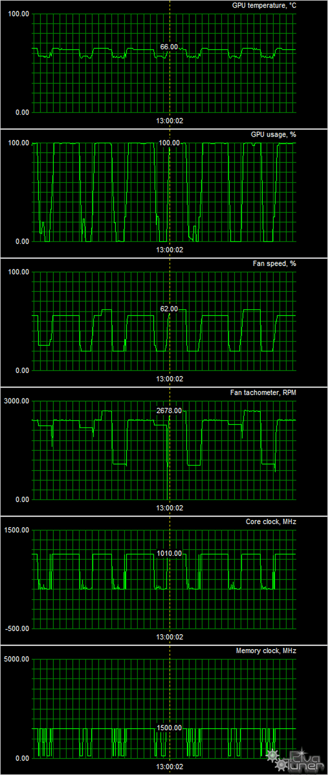В режиме максимальной нагрузки в 3D температура быстро достигала 66 °C, вентиляторы при этом раскручивались до почти 2000 оборотов в минуту (но затем частота вращения быстро падала до 1500), шум вырастал до 46,5 дБА (но на короткое время). Кулер ведет себя нестабильно: обороты постоянно резко меняются, а с ними и шум. Максимальный уровень шума у этой карты очень серьезный — как в абсолютных значениях, так и относительно решений конкурентов.