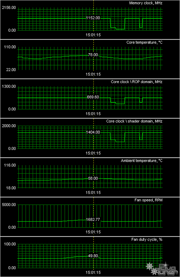 А далее мы провели исследование температурного режима с помощью утилиты RivaTuner (автор А.Николайчук AKA Unwinder) и получили следующие результаты: