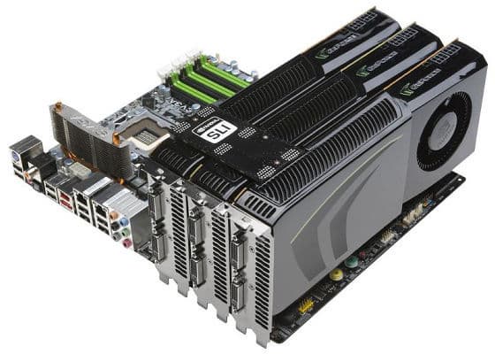 Продолжая краткое описание особенностей Geforce GTX 285, отметим, что видеокарта поддерживает и технологию SLI. Два соответствующих разъёма, установленные на плате, позволяют объединять до трёх таких плат в одной системе, что называется конфигурацией 3-way SLI. При этом используется режим мультичипового рендеринга AFR и параллельная обработка трёх кадров. В случае такой конфигурации частота кадров растёт до 80-90% на каждый следующий чип.