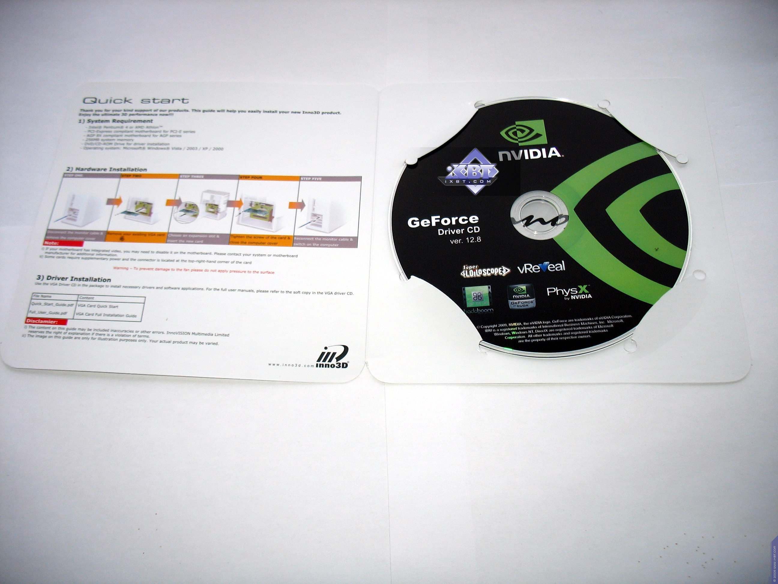 Базовый комплект поставки должен включать в себя: руководство пользователя, диск с драйверами и утилитами (да, вот дожили до таких скромных базовых комплектов, поскольку ТВ-выходов больше не ставят, потому адаптеры не нужны, а также у этих карт имеются все три гнезда вывода, следовательно, переходники также не требуются). Ниже мы покажем, что предлагается к каждой карте дополнительно.