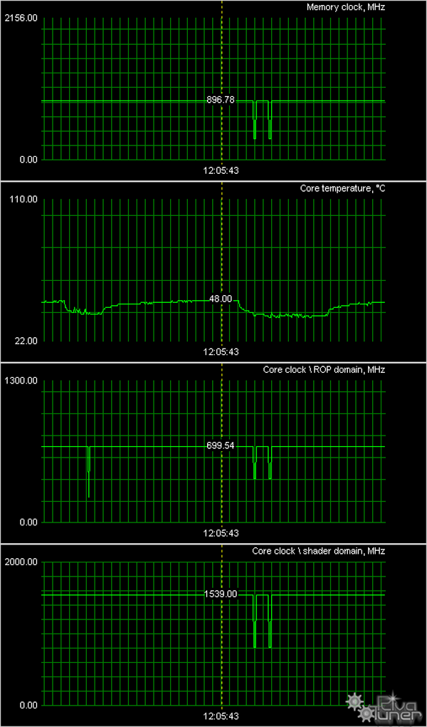 Мы провели исследование температурного режима с помощью утилиты RivaTuner (автор А.Николайчук AKA Unwinder) и получили следующие результаты (разница в температурах у всех 6 карт была очень незначительной, потому я привел пример продукта от Chaintech):