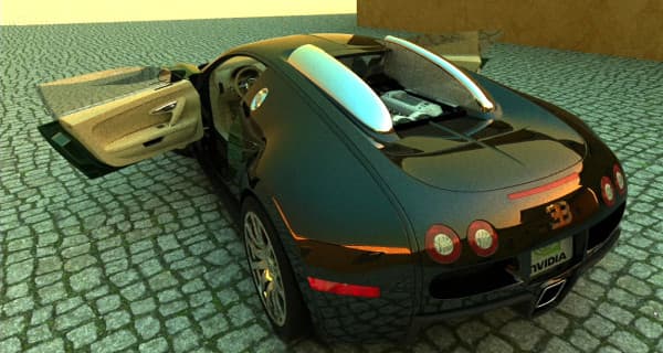 При расчёте этой сцены использовался GT200, и рендеринг почти реального времени, но чуть худшего качества, Nvidia уже показывала ранее. В этом случае используется сцена покрупнее, а также большее количество отражений лучей света при рендеринге. Всё отрисовывается интерактивно, с производительностью около 10 FPS. Это очень хороший шаг вперёд. Представьте, что будет на Fermi…