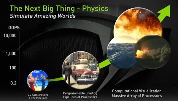Ашу рассказал о том, что ранее физические эффекты в играх были заранее просчитаны, и только совсем недавно их стали рассчитывать в реальном времени. CPU для этого подходят, но GPU выполняют параллельные расчёты ещё быстрее. Речь о технологии PhysX, использующей CUDA — ещё одной технологии компании Nvidia, которая постоянно на слуху. Конечно, не обошлось без демонстрационного видео, и при его просмотре Дженсен и Ашу не только объясняли, что происходит на экране, но и весело шутили.