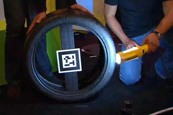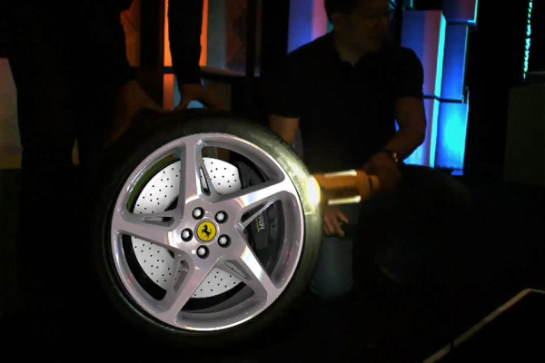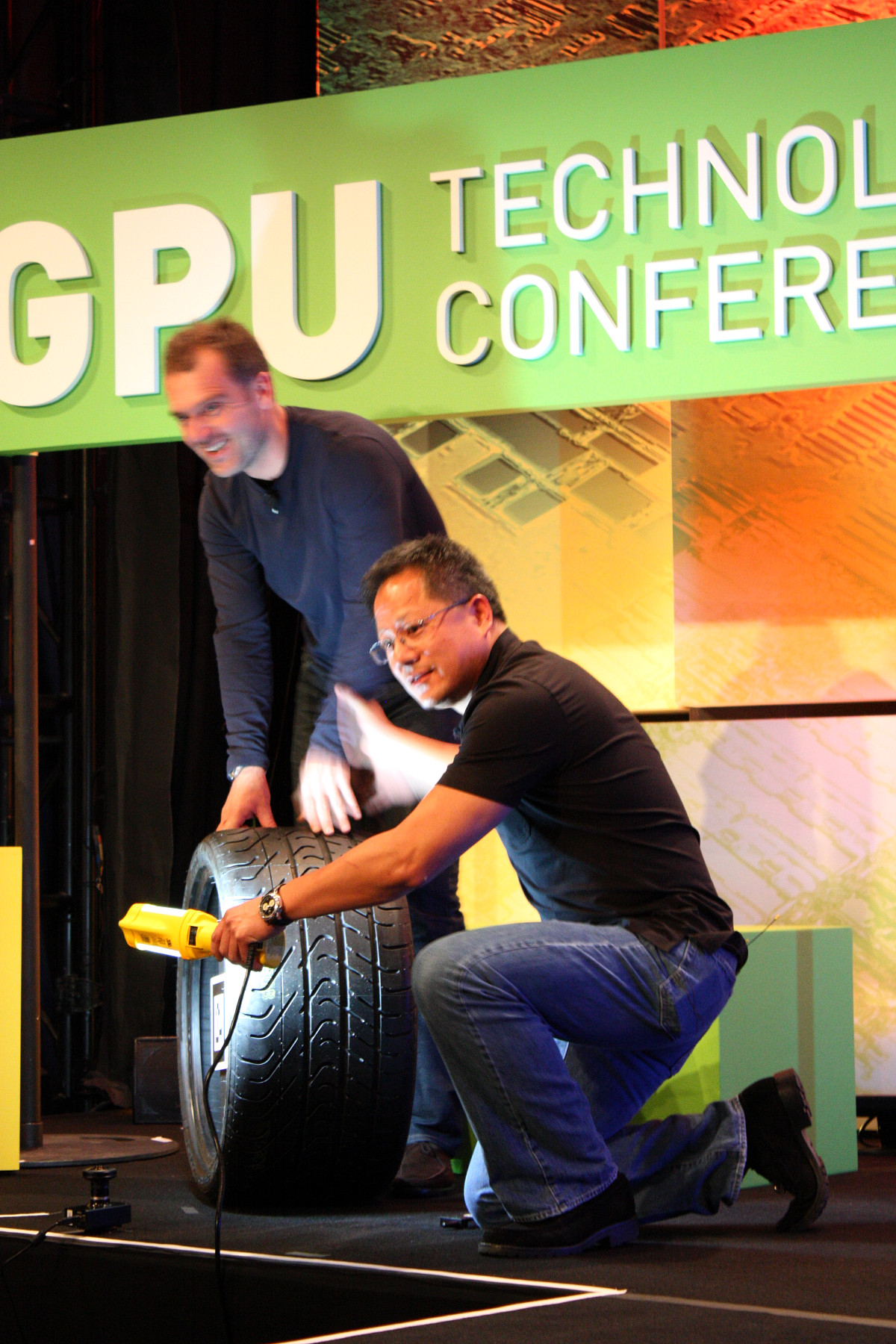 Но зрелищным было не это, а совместное выступление Дженсена со специально принесённой в зал покрышкой от Ferrari. Людвиг помогал держать покрышку, а Дженсен освещал её фонариком. «Эка невидаль!», скажет читатель, и будет совершенно прав — смысл то совсем не в этом. А в том, что на видеоэкране эта же покрышка изображалась в динамике вместе с отрендеренным колёсным диском. И при движении фонарика в реальном пространстве, освещение на отрендеренном изображении менялось точно так же.