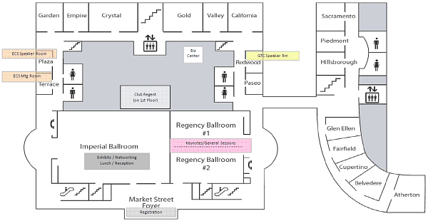 На конференции было представлено просто огромное количество компаний, учебных заведений и специалистов, а также их стендов. Просто для того, чтобы перечислить список участников, Nvidia выпустила толстенную брошюру, а также кучу другой бумажной и электронной информации. И это всё только вкратце описывало происходившее на конференции. Посмотрите на план гостиницы, все её многочисленные залы были заняты мероприятиями с утра до вечера.