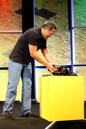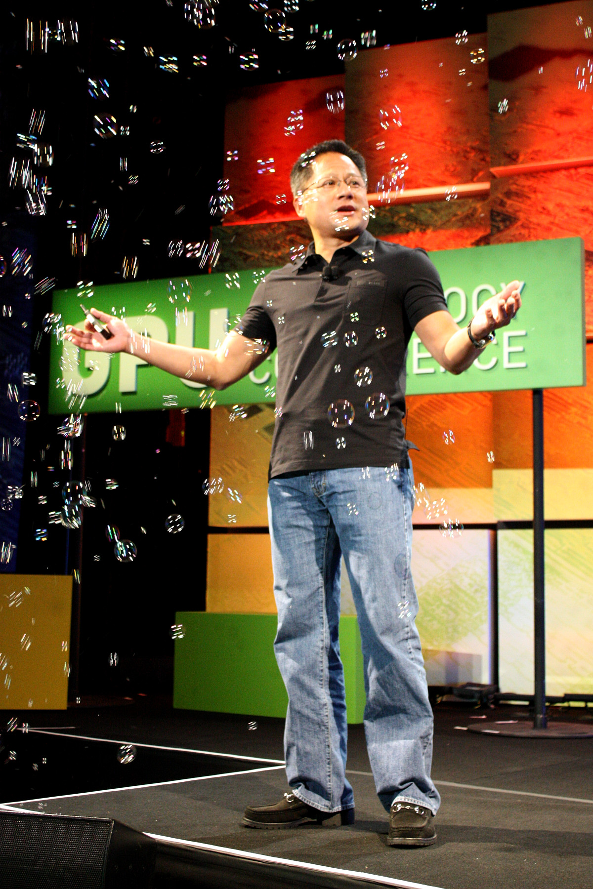 Сначала нам показали ролик об истории аппаратно ускоренной 3D графики, начиная с 1995 года и останавливаясь на таких датах, как создание первого GPU в 1997, первый программируемый GPU в 2001, появление CUDA в 2006, закончив проведением GTC в 2009. Подошло время выступления Дженсена, который появился на сцене вместе с мыльными пузырями (и чтобы никаких намёков!), задавшими положительный настрой серьёзному мероприятию с самого начала.