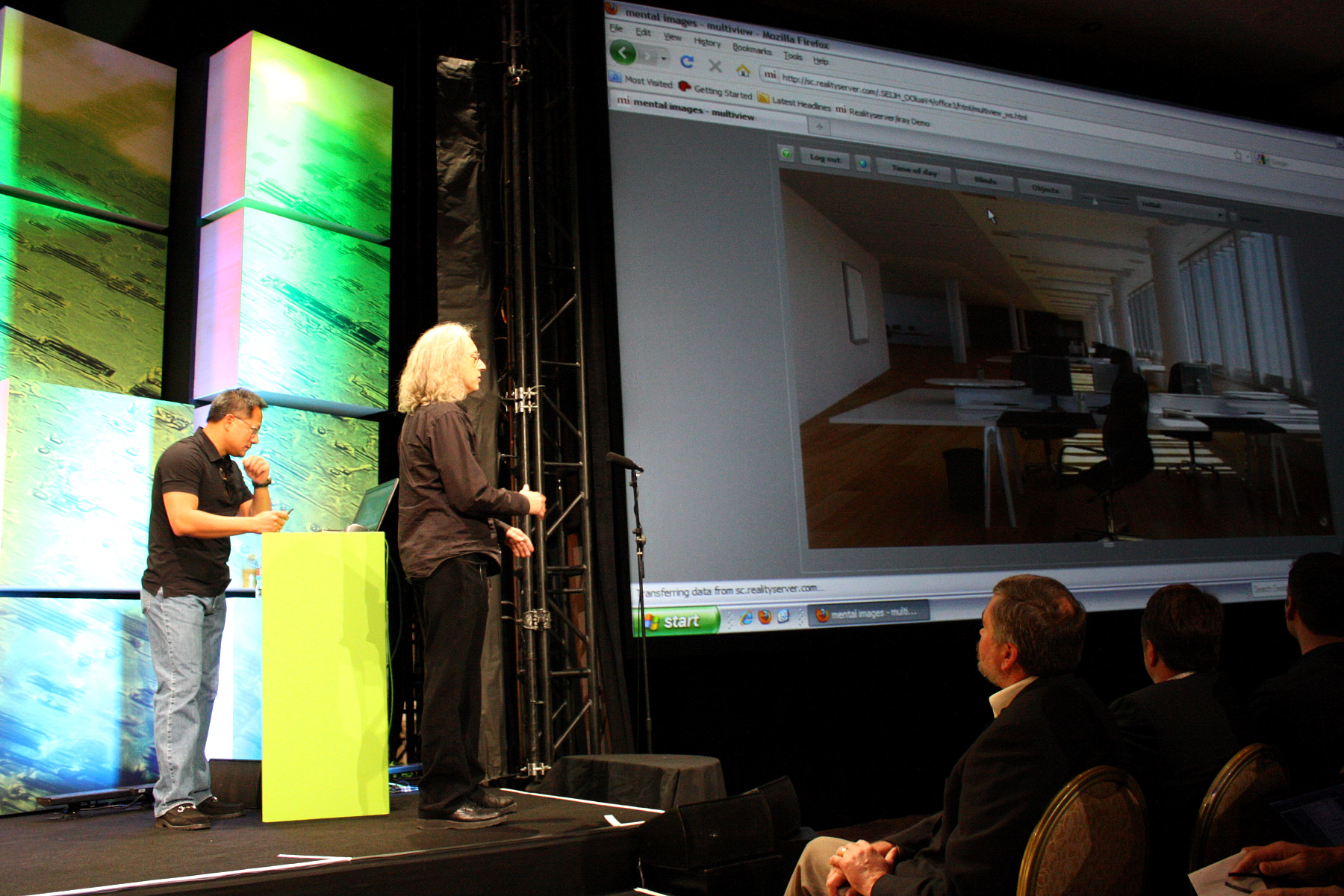 Ну а дальше показали ещё более интересную, на мой личный взгляд, технологию — потоковую 3D графику. Речь о недавно анонсированном Reality Server с iRay от mental images. Компанию представлял настоящий пионер в компьютерной индустрии, как выразился Дженсен, намекая, в том числе и на внешний вид Майкла Каплана (Michael Kaplan).