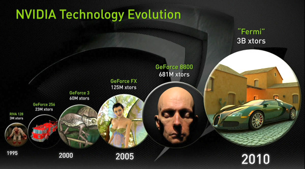 Выступление президента Nvidia началось с того, что он рассказал о событиях, произошедших за всё время существования видеочипов производства Nvidia. Презентация кратко осветила их развитие с 1995 года по нынешнее время.
