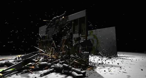 Зрителям показали имитацию поведения жидкостей, газов (дыма) с большим количеством рассчитываемых и отрисованных частиц. В общем, всё, что смотрится красиво. Но самой впечатляющей была демонстрация двух разрушаемых стен и бьющихся о них манекенов. Стены разрушались очень реалистично, даже не по кускам, а по щепочкам, и всё это — в реальном времени! Советую посмотреть этот момент в записи выступления, выложенном на сайте Nvidia.