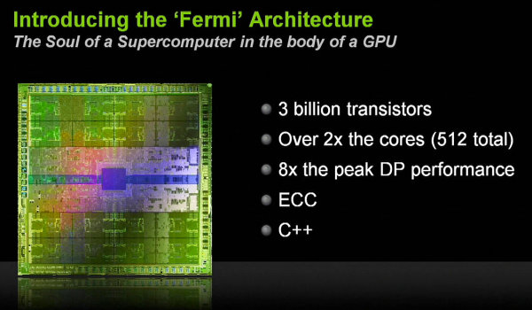 Основные особенности Nvidia Fermi в том, что это абсолютно новая архитектура GPU, созданная с нуля, а не переработка предыдущих решений. Fermi состоит из трёх миллиардов транзисторов (!), имеет 512 вычислительных блоков, точность вычислений которых соответствует новому стандарту IEEE 754-2008.