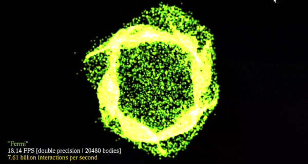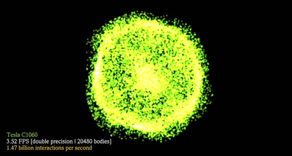 Дженсен предложил посмотреть на демонстрацию сравнения способностей нынешних GPU с тем, что в ближайшем будущем предложит Fermi. Так, производительность вычислений с двойной точностью в алгоритме n-body у нового решения превысила скорость предыдущего более чем в 5 раз: