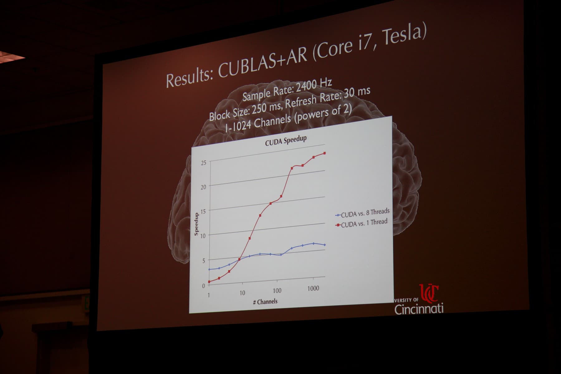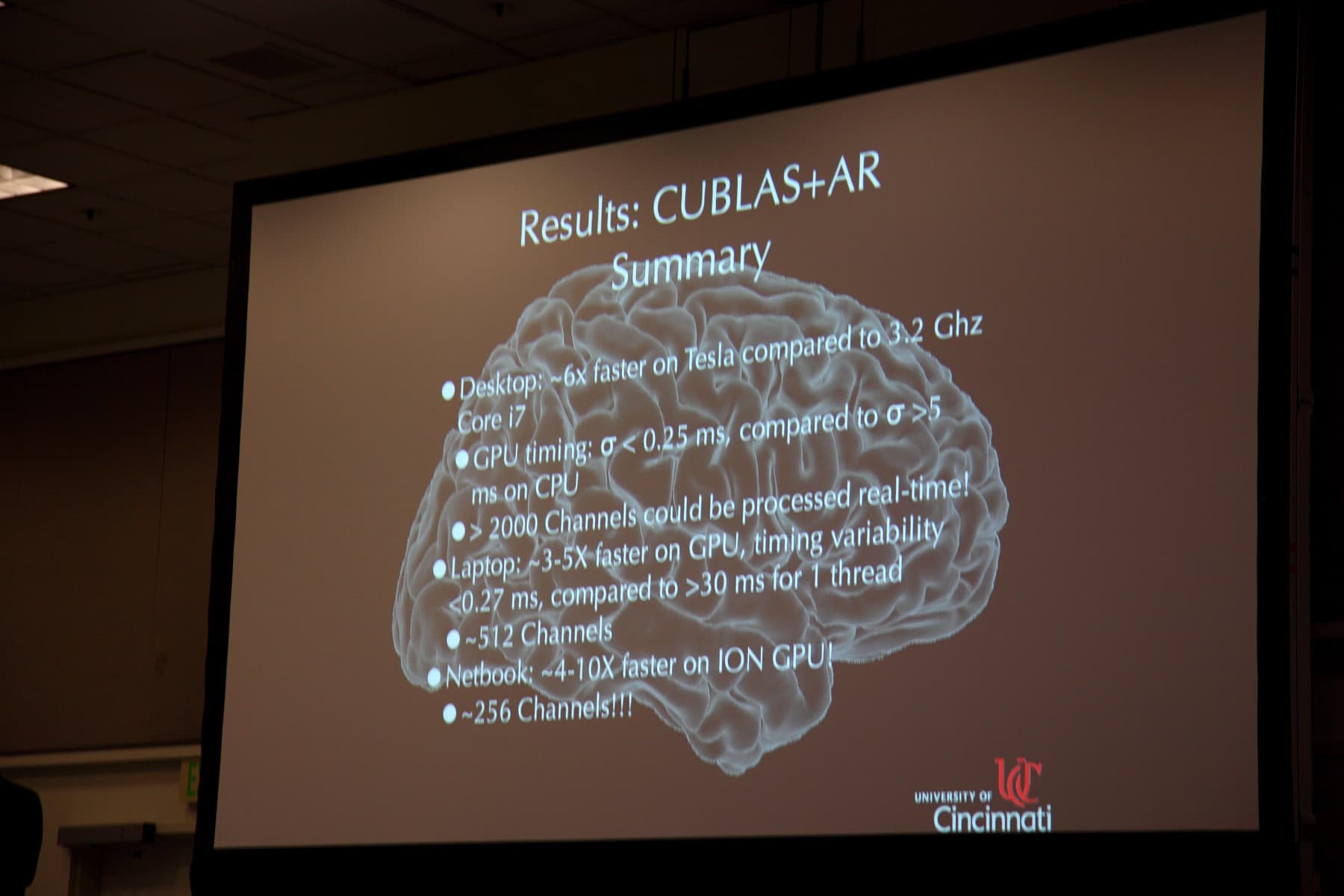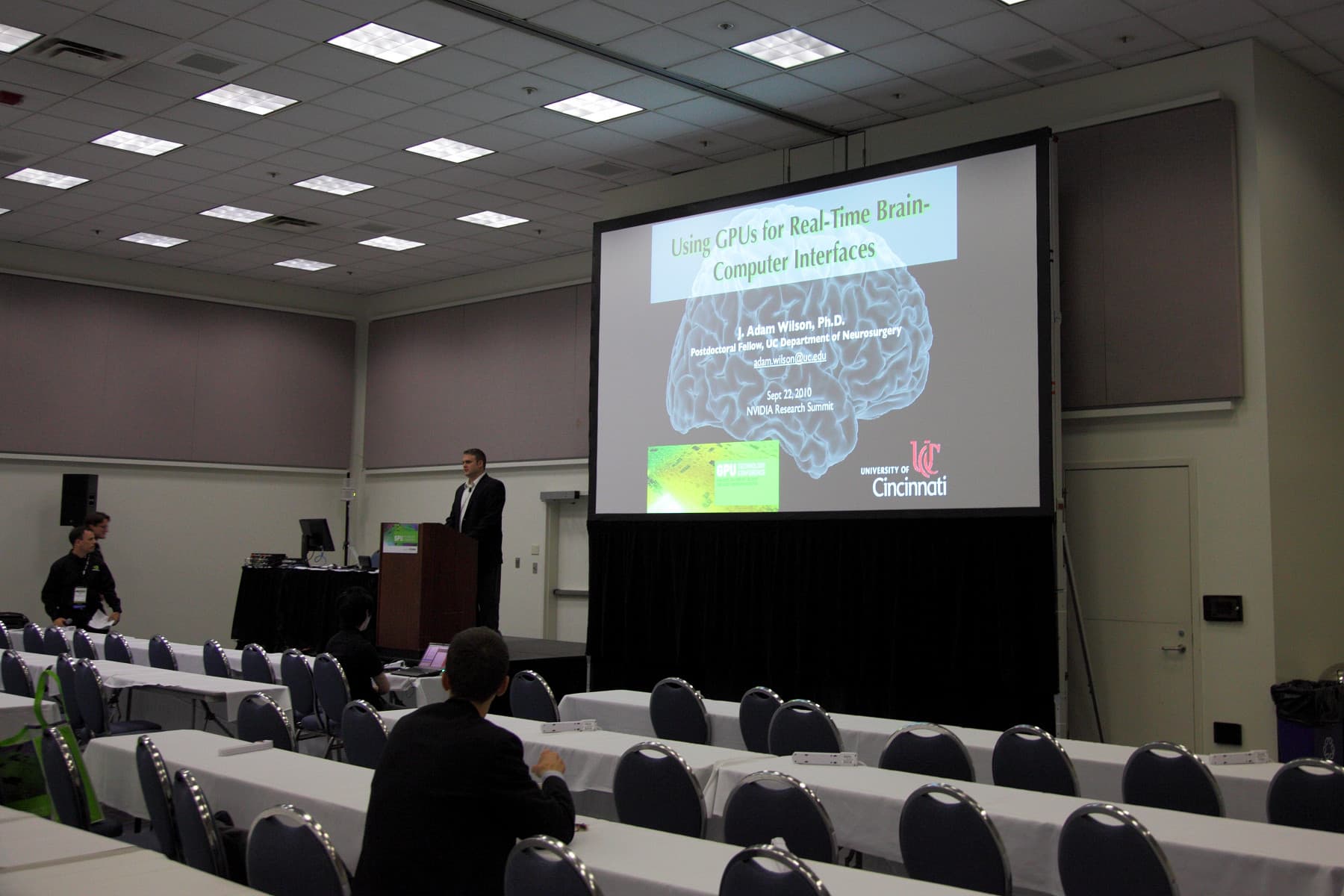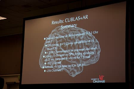 Ну а мы переходим к некоторым из наиболее интересных выступлений, которые я успел посетить в течение второго дня конференции GTC 2010. Первым хочется упомянуть выступление профессора нейрохирургии J.Adam Wilson из Университета Цинциннати, которое было довольно интересным, но, к сожалению, не очень популярным (как видите на фото — осталось много свободных мест).